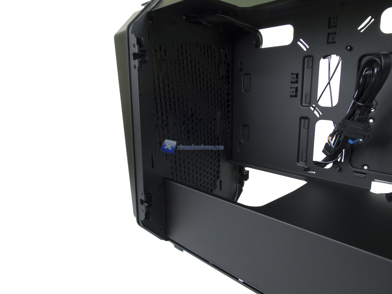 Partendo dal lato sinistro possiamo notare nuovamente la griglia che ci permetterà di installare ventole o eventuali radiatori anche in configurazione Push/Pull visti i circa 16cm di spazio che intercorrono tra frontale e Midplate. Midplate che andrà come sempre a nascondere l’alimentatore e tutti i cavi che partiranno da esso.