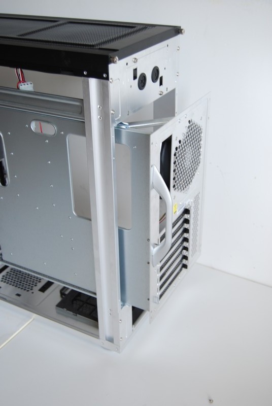 Sia sopra che sotto al piatto estraibile lo spazio è molto abbondante. Il case è infatti predisposto per installare l'alimentatore in basso o in alto. Sono presenti infatti due pannelli, uno da usare come mascherina a cui avvitare l'alimentatore e l'altro da usare come copertura e predisposto per il passaggio dei tubi dell'impianto a liquido. Originariamente si trovano il primo in basso e il secondo e in alto ma le rispettive posizioni possono essere scambiate semplicemente svitandole 4 viti con cui sono fissati al resto del case.
