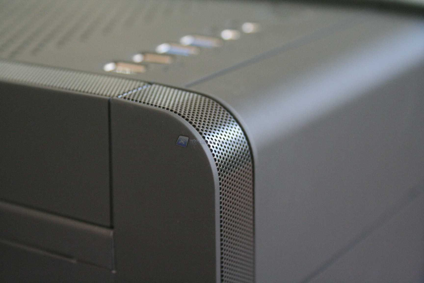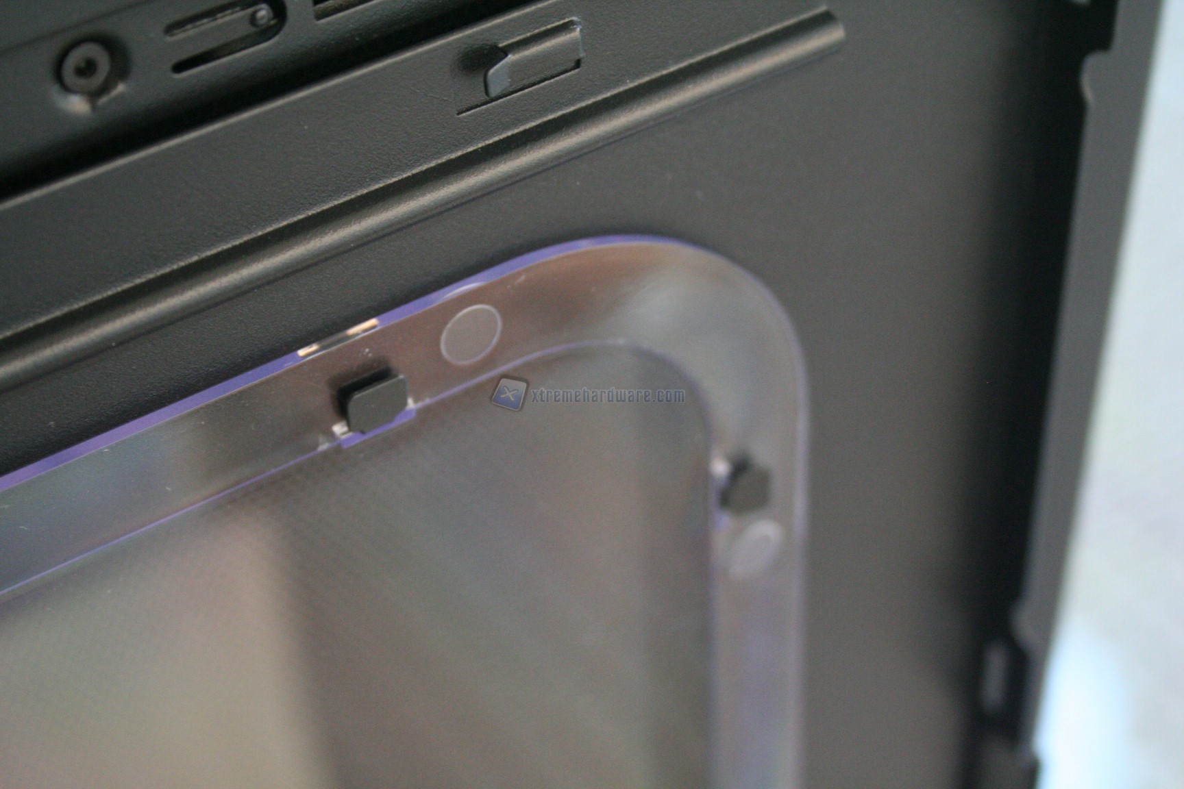 Il frame anteriore è monolitico e si caratterizza per un materiale plastico con finitura anti-impronta digitale. Sebbene all’inizio quest’ultima sia presente, dopo poco tempo viene assorbita, il che aumenta quindi l’impatto visivo. Le aperture di ventilazione inferiori permettono l’immissione frontale verso due ventole da 120mm, che però non sono fornite entrambe dalla casa madre. Non poteva ovviamente mancare il filtro antipolvere sottostante, la cui rimozione però è associata alla rimozione stessa del pannello frontale. L’installazione delle periferiche da 5.25” nella parte superiore è molto facile ed in totale sono tre.