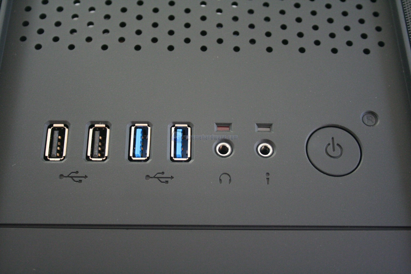 Nella parte superiore troviamo gli ingressi USB, inseriti direttamente nel secondo pannello anti-impronta. Sono presenti 2x3.0, 2x2.0 audio, mike, accensione e reset. Come si evince dalle foto, la lavorazione degli spigoli è particolare in quanto sono presenti due bande in mesh che partono dalla porzione anteriore e terminano alla fine di quella superiore. Nella parte superiore ovviamente sono presenti le medesime aperture forate precedenti.