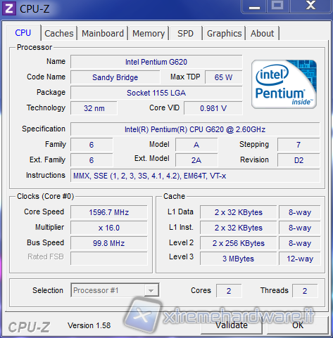 Come già accennato il processore utilizzato è un Intel Pentium G620, un 32nm Dual-Core senza Hyper Threading (due soli core logici) appartenente alla famiglia Sandy Bridge. La frequenza di funzionamento è di 2,6GHz mentre la cache a disposizione è di 3MB L3. Tale processore non è predisposto per la tecnologia Intel Turbo Boost né per la tecnologia Hyper Threading.