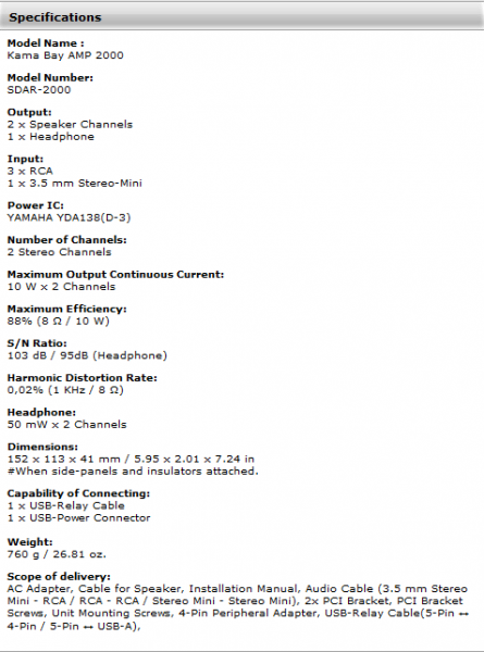 Scythe col suo amplificatore Kama Bay AMP 2000, venduto ad un prezzo di circa 50€, vuole straziare la concorrenza proponendo sul mercato un prodotto estremamente valido e caratterizzato da un ottimo rapporto qualità / prezzo. Dubitiamo che sul mercato si possa trovare un prodotto con simili caratteristiche ad un prezzo così economico.