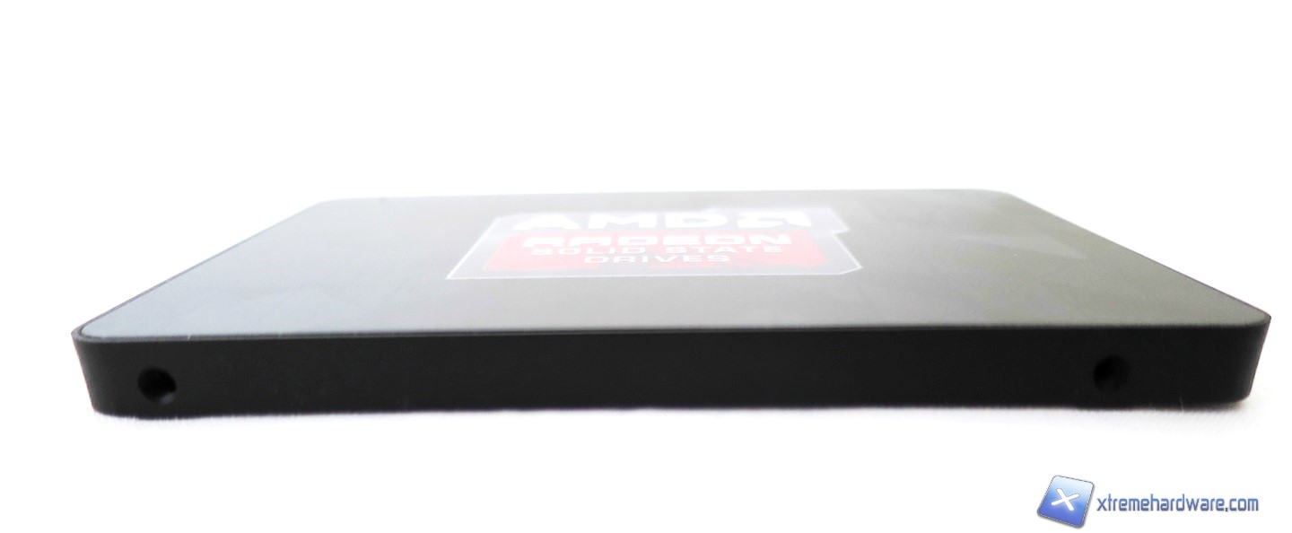 Passiamo ora ad analizzare il Radeon R7. Come la confezione, anche l’SSD ha un design aggressivo e particolare con riferimenti al brand AMD ed alla serie Radeon omonima. Nella parte superiore infatti è applicato questo adesivo con texture poligonale di sfondo che completa lo chassis in alluminio di colore nero. SSD davvero particolare a livello di design. Sarà sicuramente apprezzato da fan AMD o semplicemente da chi ha una build con colori dominanti rosso e nero. Le dimensioni del drive sono di 99.70 x 69.75mm con uno spessore ormai classico di 7mm per permettere il montaggio dell’unità anche in Ultrabook. Il peso è di 115g e lo chassis come detto è sempre in alluminio per assicurare qualità complessiva al prodotto.