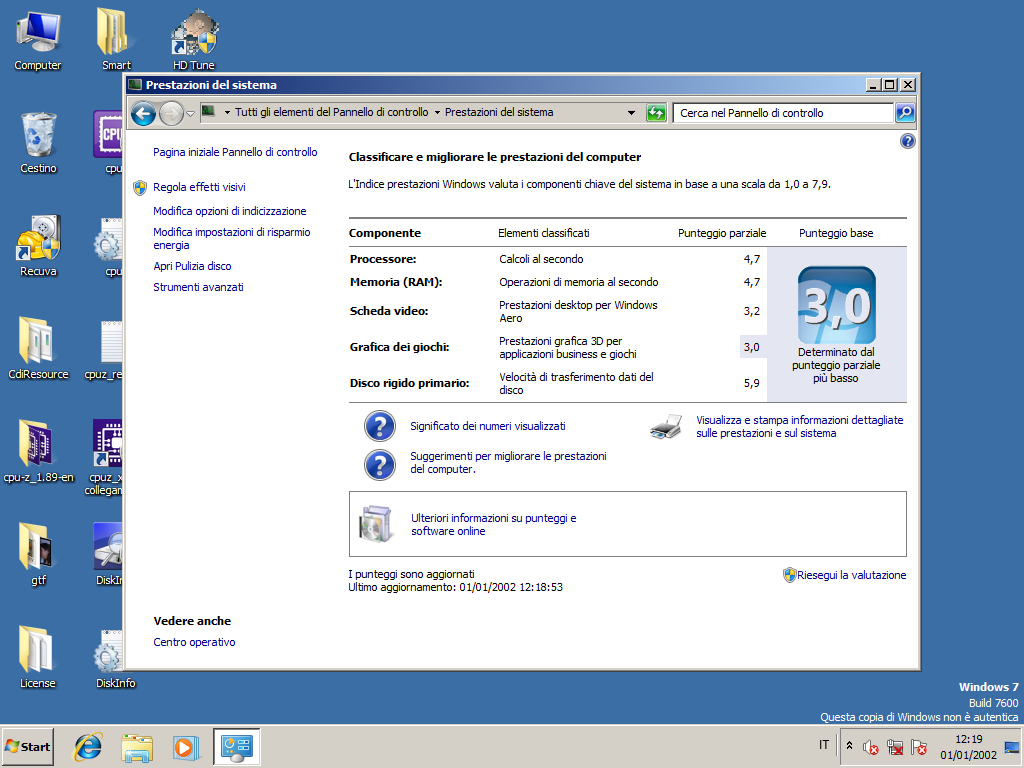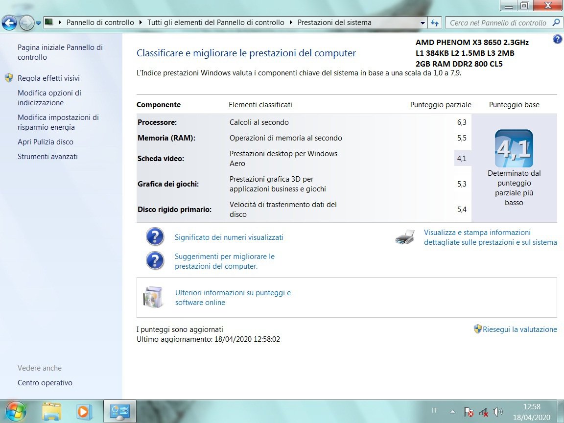 Cambiando CPU, il punteggio di Win7 P.Sistema è aumentato abbastanza, passando da un 4.2 a un 6.3 :yeah:/emoticons/7.gif.35d2e8095971647357798be136f705a3.gif" title=":yeah:" width="55" >(+50%) poi ha influito persino sulla RAM che va da 5.3 a 5.5, aggiornando Win7 con il SP1 anche la scheda video ha migliorato il punteggio passando da 3.3 a 4.1 e da 4.7 a 5.3, quindi attualmente il punteggio delle Prestazioni del Sistema è salito dal precedente 3.3 all'attuale 4.1, ricordo per info che il PC Internet (ex) aveva solo 2.0.