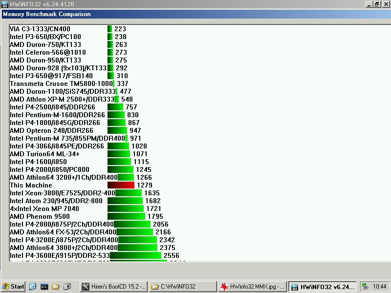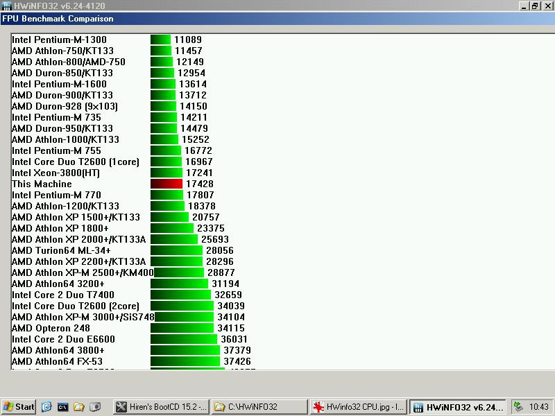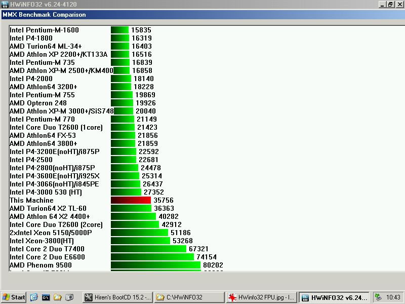 Notavo in HWinfo32 che i valori più strani sono quelli del MMX, con CPU come i Duron e altri che fanno punteggi alti oppure è il P4 che li fa bassi.