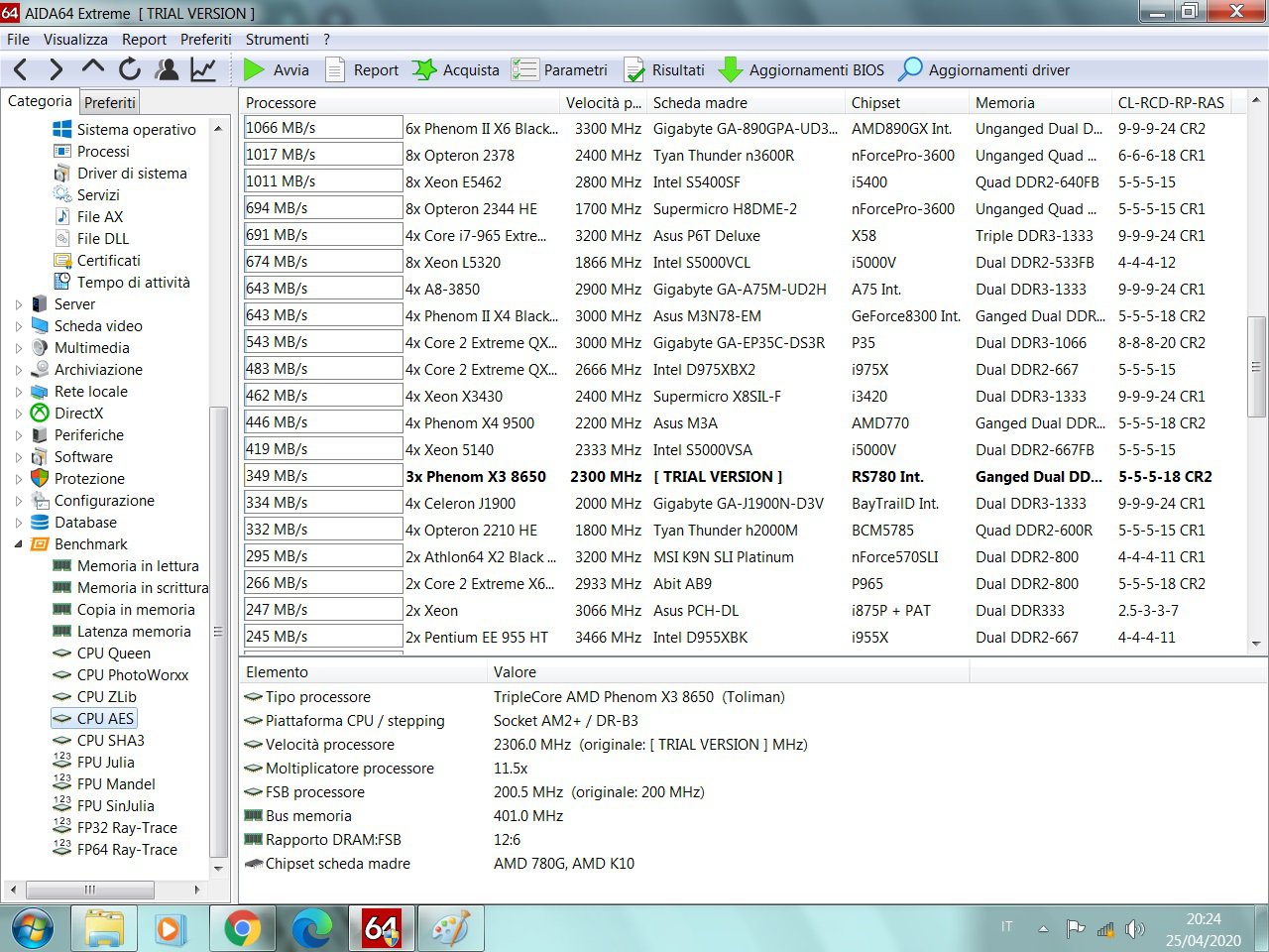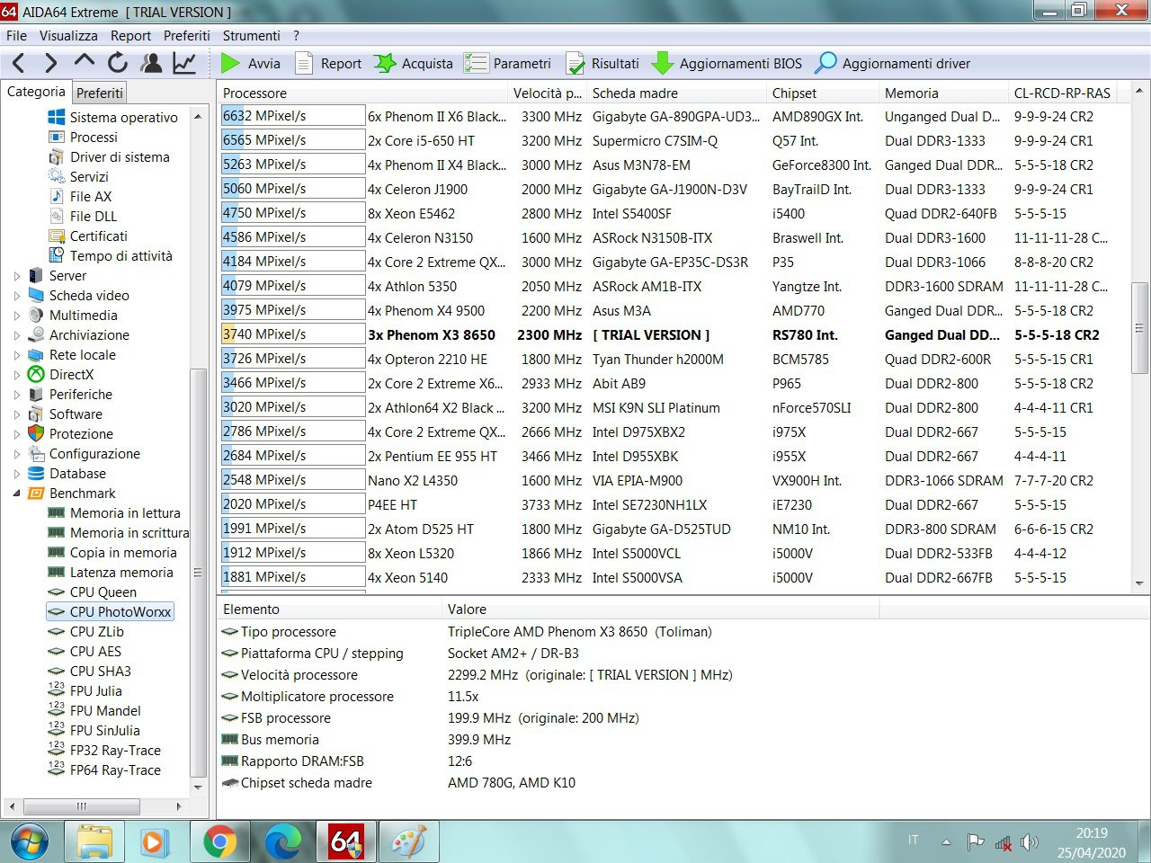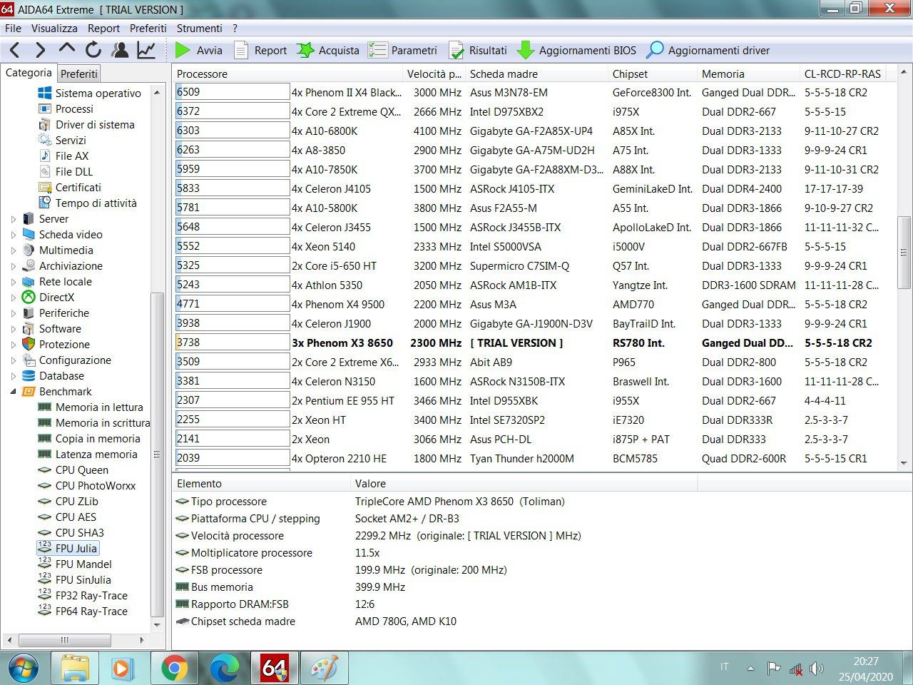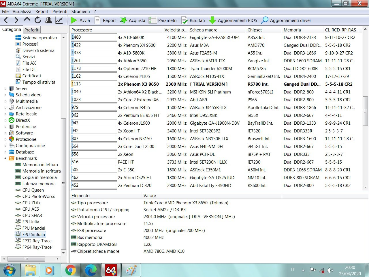 Ho scaricato nel PM questo programma di diagnostica del sistema, ver.6.25.5400 è una versione di valutazione (30gg), l'ho installato sul PC Internet e ho fatto i bench, all'interno dei bench c'è un elenco abbastanza completo di varie CPU dai socket 7 a CPU che al momento pochi possono permettersi, ma magari tra 10 anni chissà magari diventano accessibili. Metto le immagini, sono un po' tante ma se volete, la prossima volta metto un link e le immagini le metto da un'altra parte.