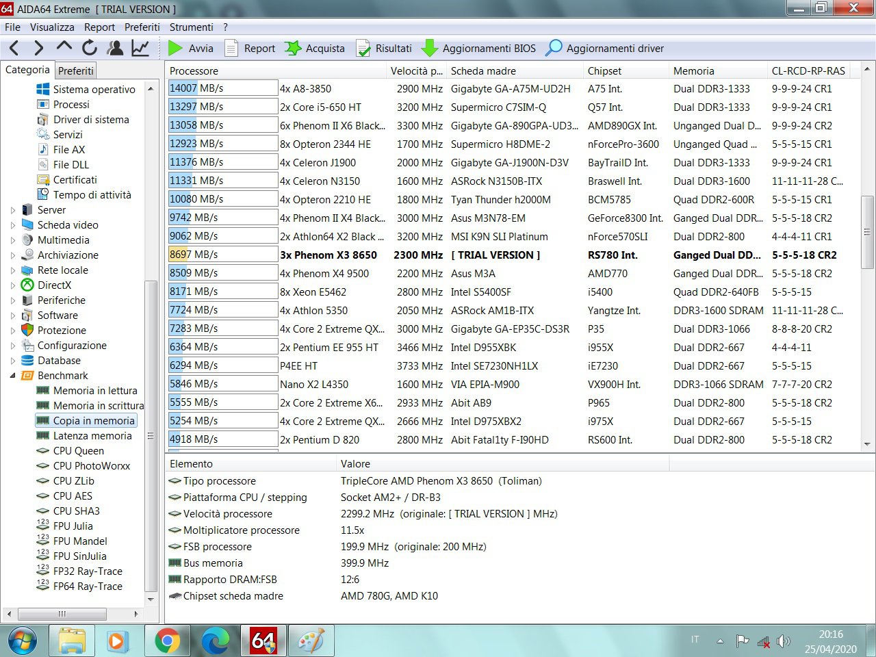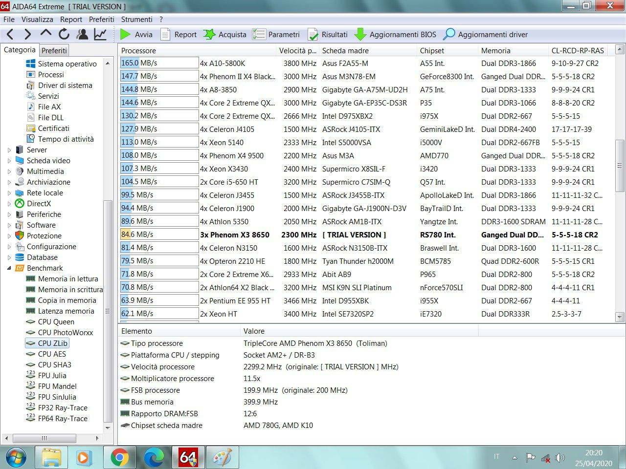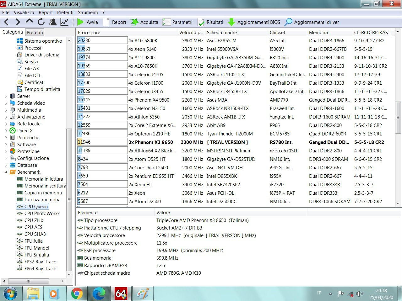 Ho scaricato nel PM questo programma di diagnostica del sistema, ver.6.25.5400 è una versione di valutazione (30gg), l'ho installato sul PC Internet e ho fatto i bench, all'interno dei bench c'è un elenco abbastanza completo di varie CPU dai socket 7 a CPU che al momento pochi possono permettersi, ma magari tra 10 anni chissà magari diventano accessibili. Metto le immagini, sono un po' tante ma se volete, la prossima volta metto un link e le immagini le metto da un'altra parte.