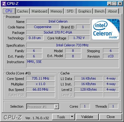 Le immagini rendono bene l'idea metto prima solo CPU-Z, i bench sono solo con Celeron 733 e C3 600, proverò nei prossimi giorni altre CPU Intel FSB100, se dovessero dare problemi (con le memorie:damnmate:/emoticons/damnmate.gif.284c37e5e3bd3302e5ddf2f07e498c2e.gif" title=":damnmate:" width="53" >) tornerei al Celeron ma passerei al 766 che potrebbe andare senza problemi a 862.5 (FSB75).