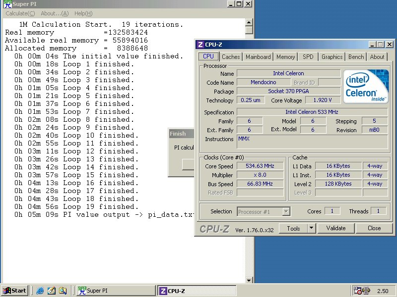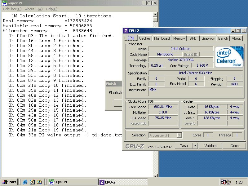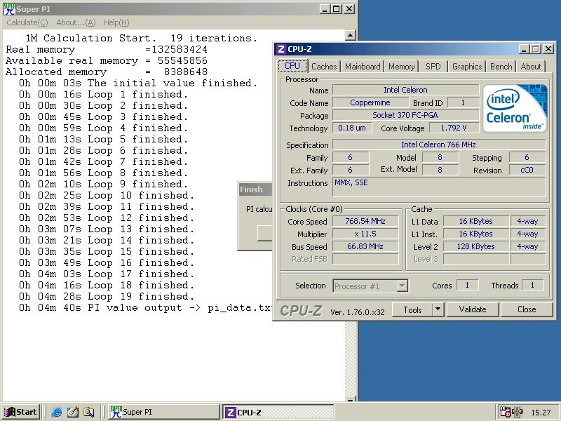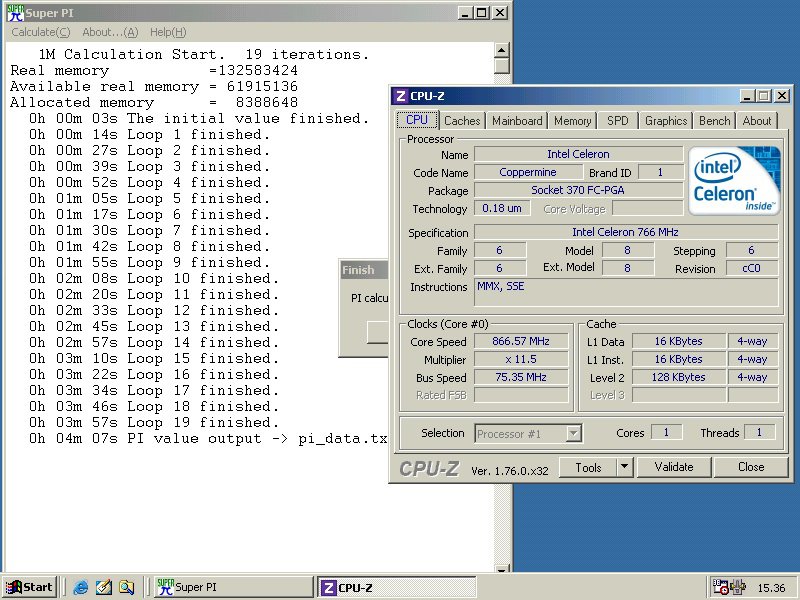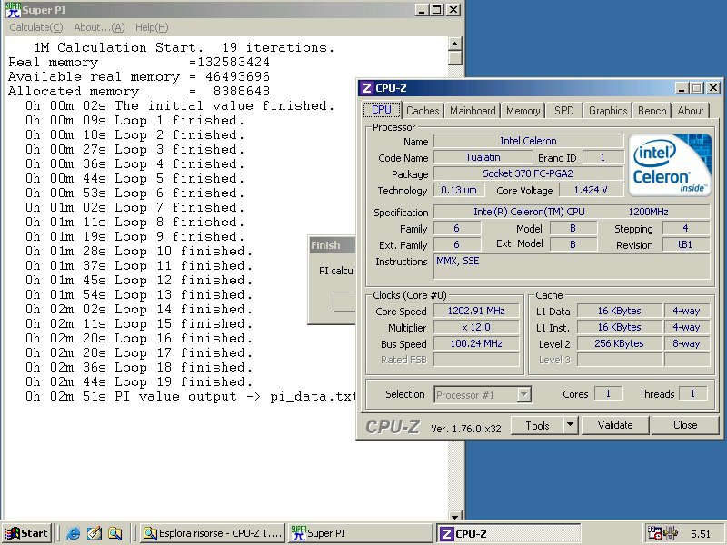 Metto anche qui il Super PI ottenuto con le frequenze di 1200 1344 e 1488, se si avviava a 1600 sicuramente avrei fatto meglio avvicinandomi ai 2 minuti e qualcosa. E quelle del Celeron 766 a 766 e 866MHz.