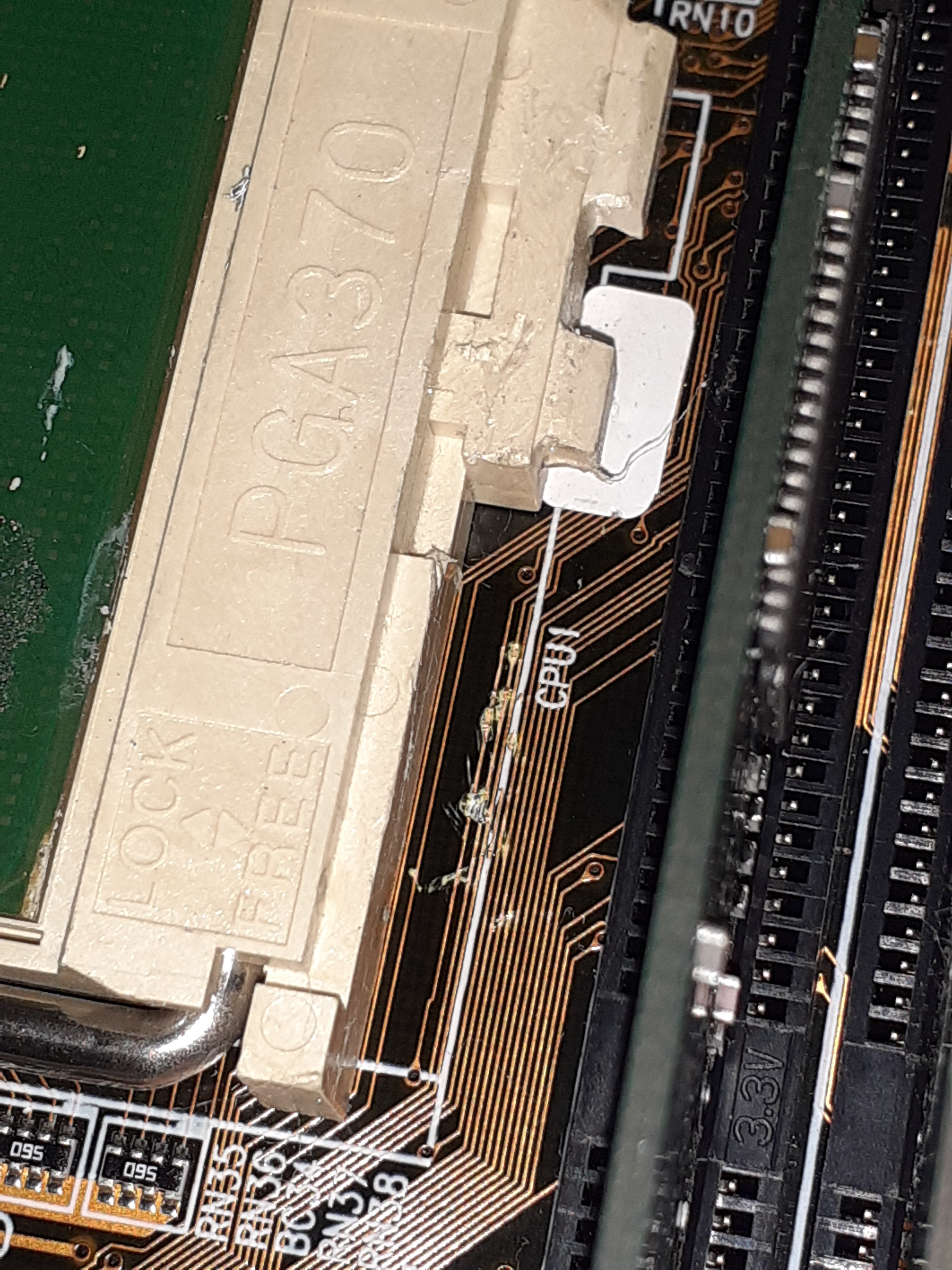 Ora non saprei cosa sia successo, ma noto dei segni evidenti sulle tracce vicino al socket7, penso siano il risultato di un tentativo di rimozione del dissi della CPU, in cui il cacciavite sia scappato varie volte, se i colpi sono stati abbastanza forti (e vedendo i segni mi sembra di si:muro:/emoticons/muro.gif.6709e291b079e93924b744bfde44f3a4.gif" title=":muro:" width="25" />) le tracce dovrebbero essersi interrotte, per cui andrebbero ripristinate (cosa non semplice ma possibile se si ha l'esperienza necessaria), è quasi sicuro che i beep siano dovuti all'interruzione delle tracce.