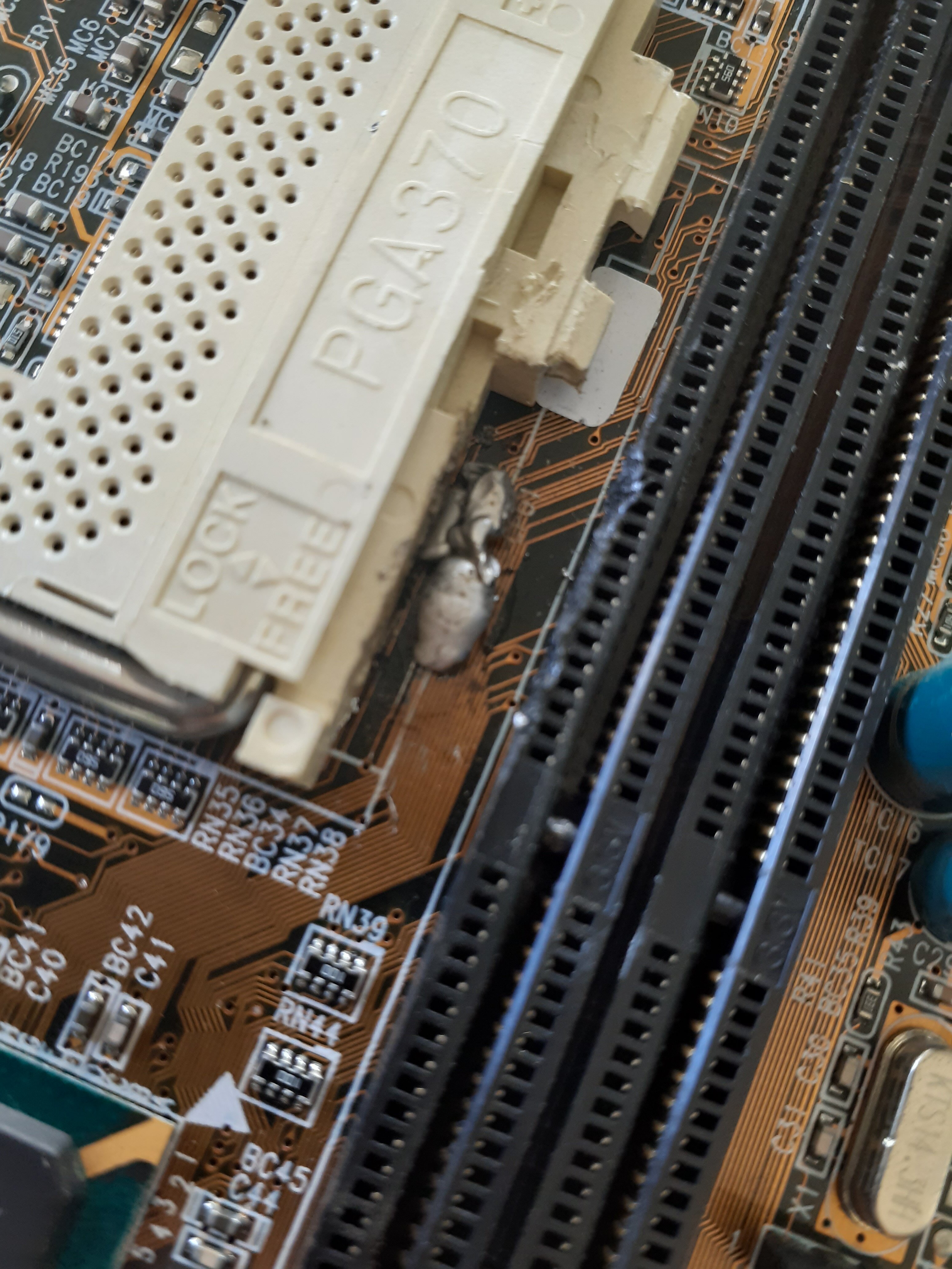Ora non saprei cosa sia successo, ma noto dei segni evidenti sulle tracce vicino al socket7, penso siano il risultato di un tentativo di rimozione del dissi della CPU, in cui il cacciavite sia scappato varie volte, se i colpi sono stati abbastanza forti (e vedendo i segni mi sembra di si:muro:/emoticons/muro.gif.6709e291b079e93924b744bfde44f3a4.gif" title=":muro:" width="25" />) le tracce dovrebbero essersi interrotte, per cui andrebbero ripristinate (cosa non semplice ma possibile se si ha l'esperienza necessaria), è quasi sicuro che i beep siano dovuti all'interruzione delle tracce.
