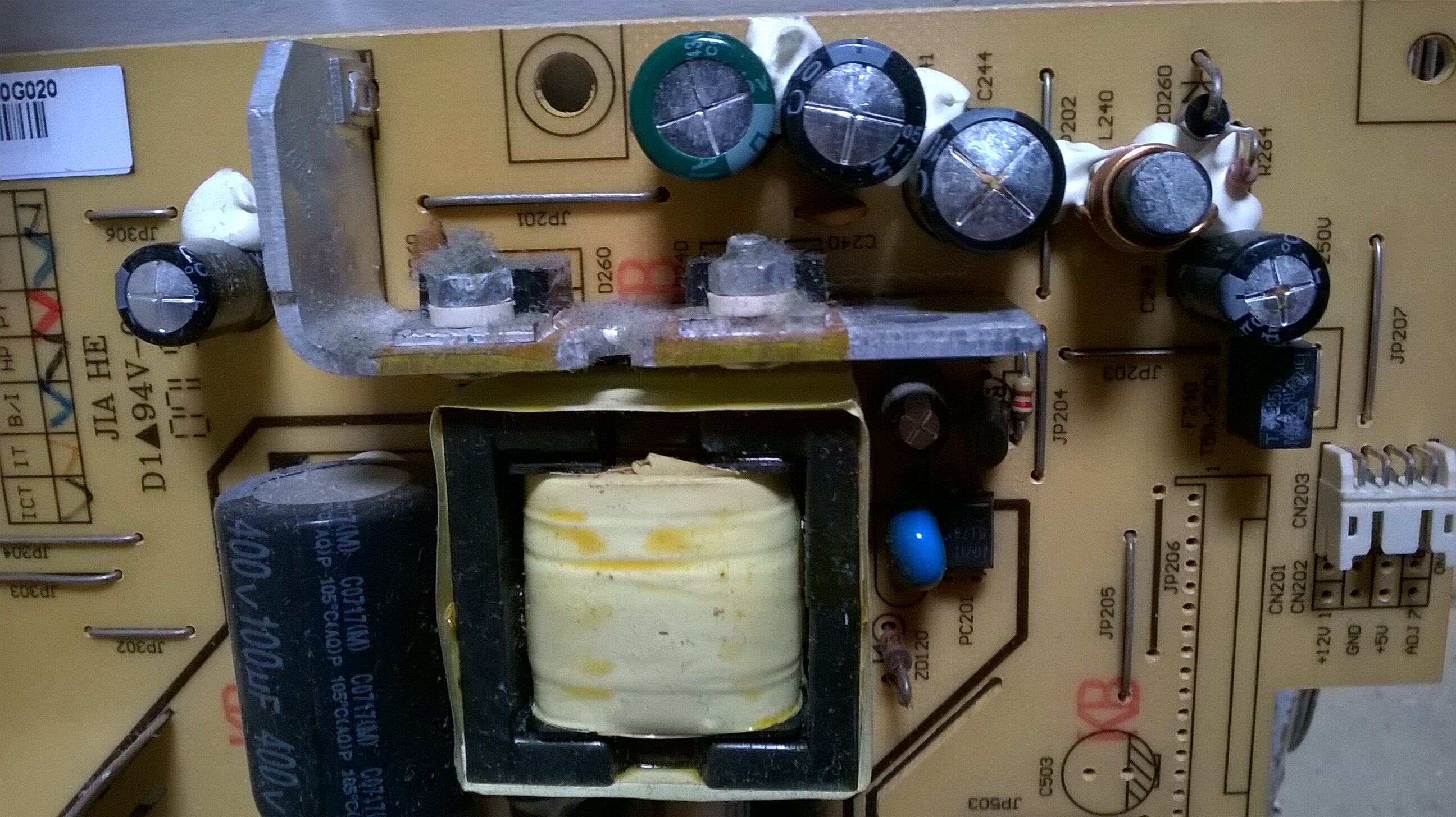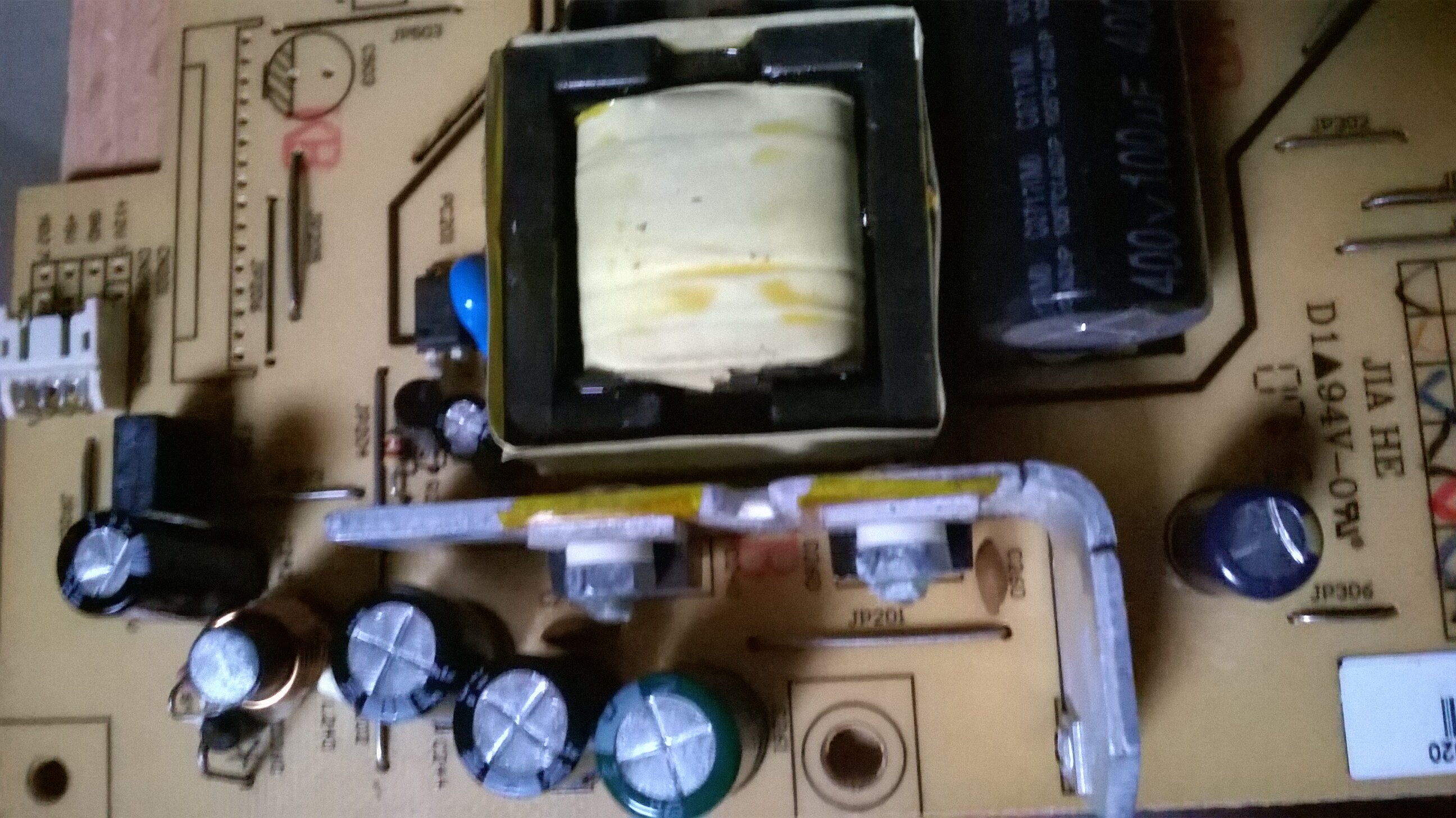 Altro tentativo collego il monitor senza il cavo VGA, e provo ad accenderlo, purtroppo il LED resta spento e quindi, la mia previsione che la riparazione potesse durare parecchi anni, si è rivelata troppo ottimistica, decido in seguito di smontarlo per controllare la scheda di alimentazione, non c'è nulla di evidente che sia guasto, controllo i due fusibili ma sono ok, domani controllerò gli altri condensatori, in totale sono tre più uno grosso, spero di trovarne uno KO, altrimenti non sarà semplice trovare quale componente si sia guastato, escluderei che il guasto si trovi nella minischeda con la porta VGA, anche li ci sono dei condensatori piccoli, ma dato che il LED PWR resta spento, mi fa pensare che sia un problema della scheda di alimentazione.