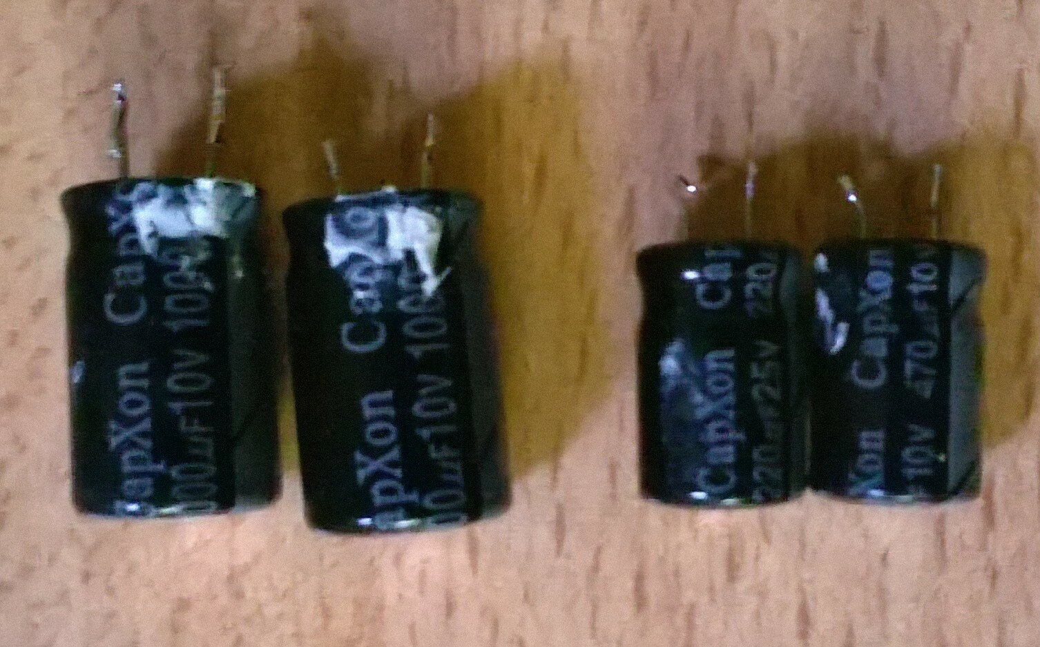 Dopo lo smontaggio della scheda di alimentazione (FSP032-2PI01V), è evidente quale sia il problema (immaginavo fosse quello), alcuni condensatori elettrolitici sono rigonfi, su sette totali quattro sono sicuramente da cambiare, sono tutti della Capxon, marchio immagino di qualità abbastanza scadente, inizio la rimozione e la verifica dal C303, un 220uF 25V è in perdita ed ha un ESR di 6.4OHm, ovviamente va cambiato, passo a due da 1000uF 10V (C241 e C244), anche questi sono in perdita e hanno un ESR alto, verifico anche il C242 un 470uF 10V idem (come gli altri).