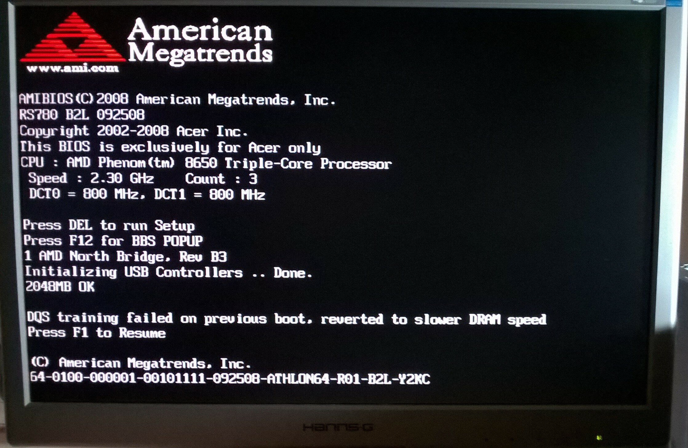Tornando brevemente al monitor HannsG, oggi ho fatto un test collegandolo al New PC IN (Phenom), tutto è andato come pensavo, è tornato a funzionare, ma ad un certo punto il PC si spegne o riavvia, comunque il problema deve essere nel PC, visto che il monitor resta con il led arancio, dopo un po di tentativi riesco a far ripartire il PC, visualizza una schermata del BIOS, con un messaggio che non so esattamente cosa significhi, c'è scritto DQS training failed on previous boot... ecc...