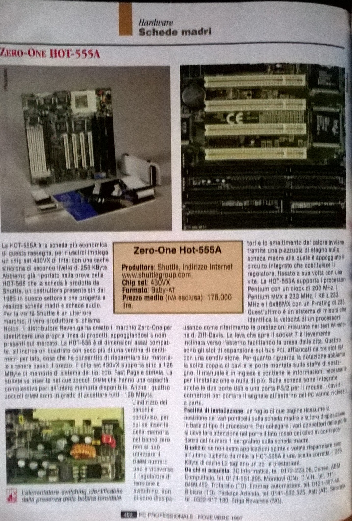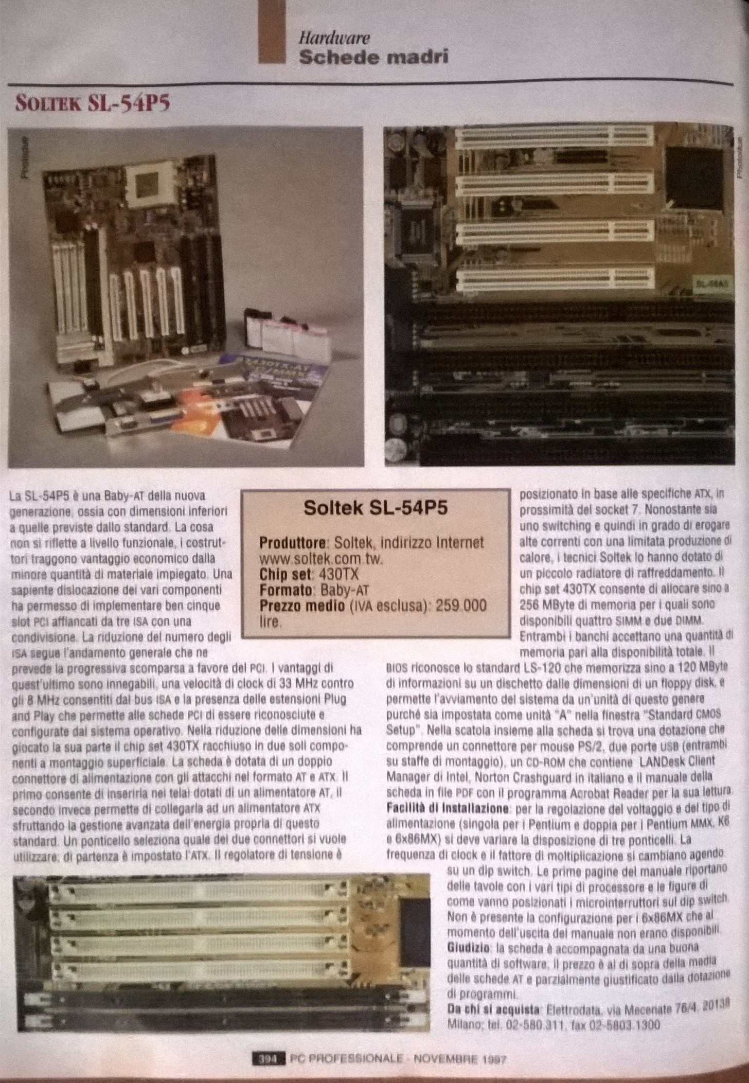 Metto alcune delle altre immagini di schede madri, prese dalla rivista di informatica, sempre in tema di socket 7, non so siano leggibili, ma eventualmente posso fare dei dettagli, faccio notare però che le foto non sono molto definite, a quei tempi non era possibile avere immagini come quelle odierne, la risoluzione era nettamente più bassa, e probabilmente quelle foto della rivista, potrebbero non sono state fatte con macchine fotografiche digitali, allora era più semplice usare quelle del periodo con i rullini.