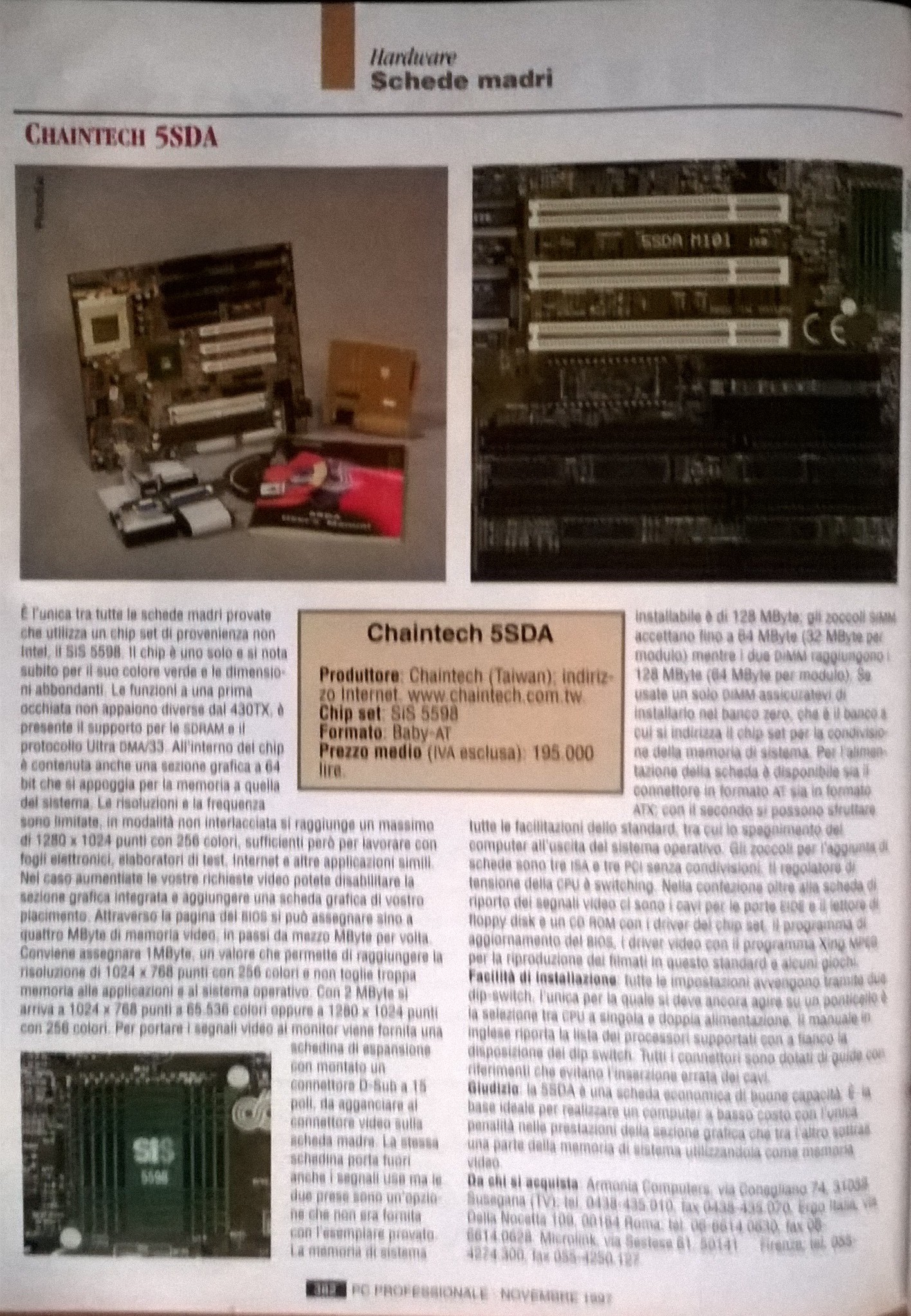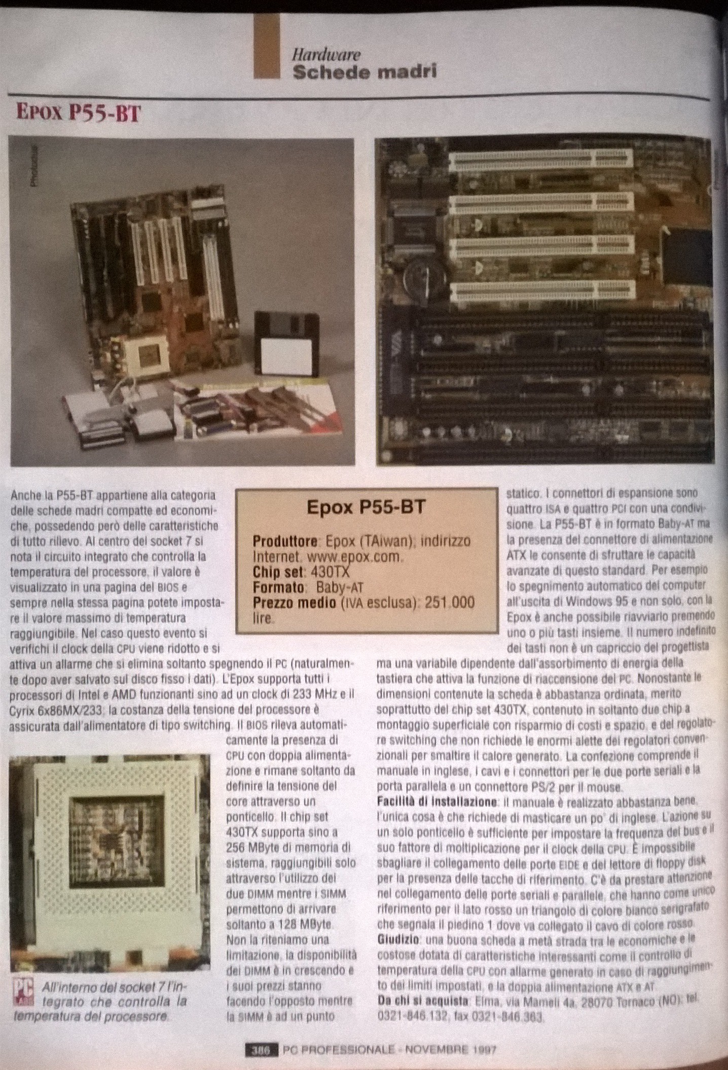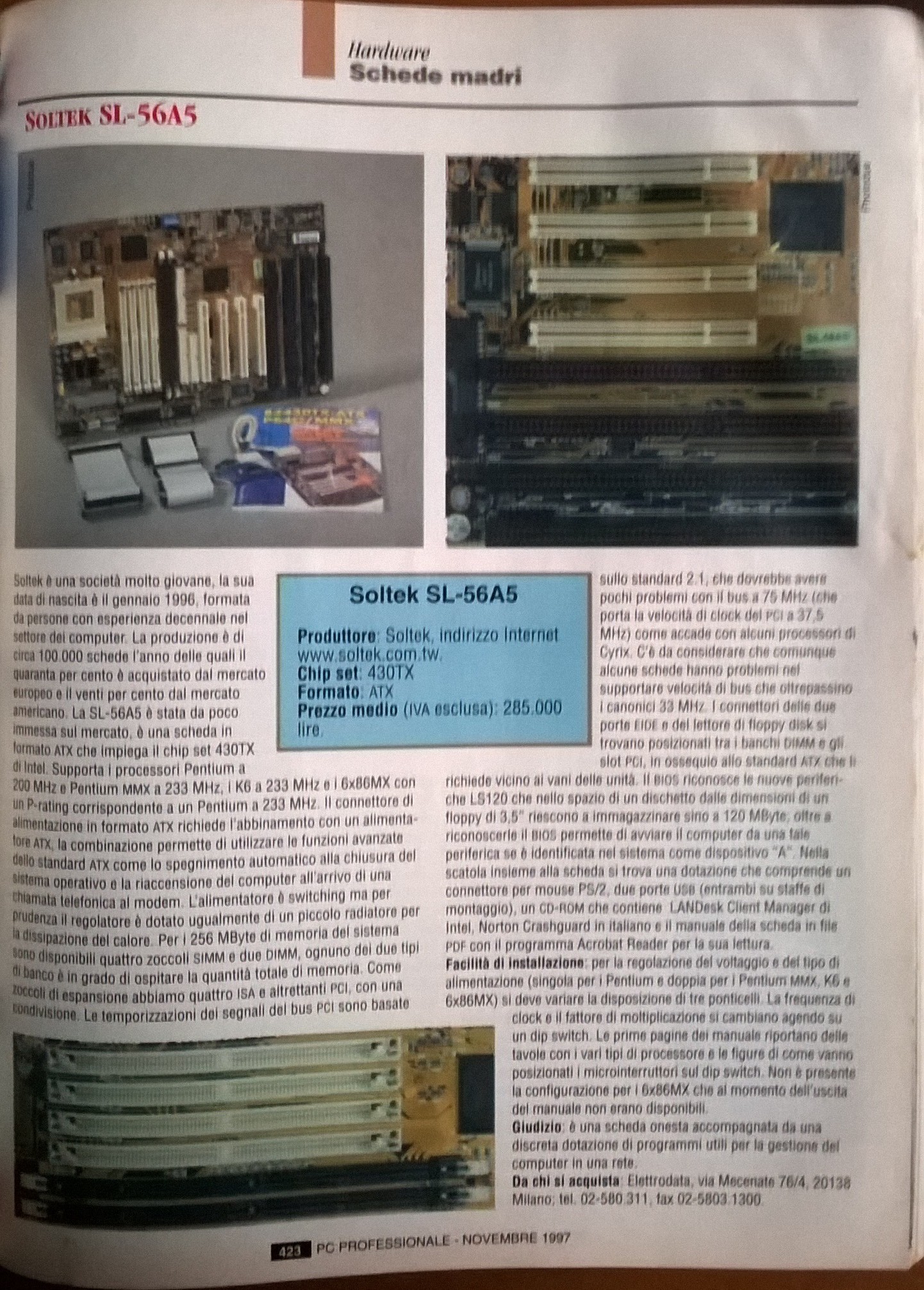 Metto alcune delle altre immagini di schede madri, prese dalla rivista di informatica, sempre in tema di socket 7, non so siano leggibili, ma eventualmente posso fare dei dettagli, faccio notare però che le foto non sono molto definite, a quei tempi non era possibile avere immagini come quelle odierne, la risoluzione era nettamente più bassa, e probabilmente quelle foto della rivista, potrebbero non sono state fatte con macchine fotografiche digitali, allora era più semplice usare quelle del periodo con i rullini.