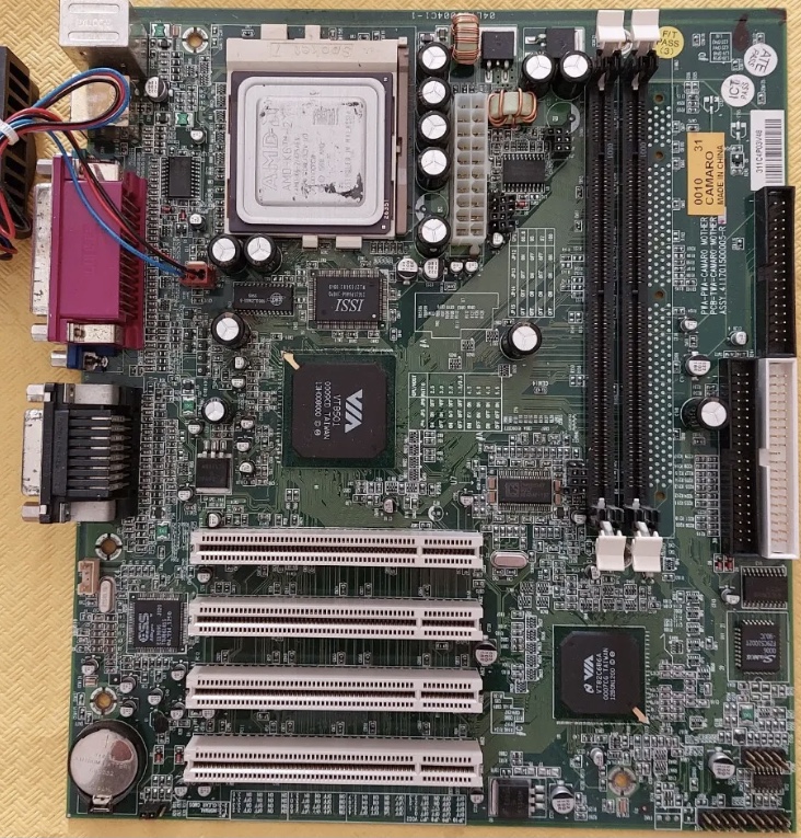A parte questo, torno brevemente ? sui socket 7, tra qualche giorno mi arriverà una MB con K6-2 (sembra un 475, dato che non si legge bene ?), è di un PC di marca, non ricordo quale (HP o Acer o altro???), la scheda madre è una Camaro (no no non va in ? auto), ha chipset VIA (non saprei il modello esatto), non ha AGP, ma ha audio e video ? integrato, sono presenti ben 4 slot di espansione di tipo PCI (non express ovvio ?), il formato e microATX, per il resto devo cercare ? ulteriori info On-Line, l’unica cosa ? che devo avere certezza, è che il connettore di Alimentazione vada bene ? con un normalissimo alimentatore, e non richieda un adattatore, perché il produttore abbia usato connessioni non standard.