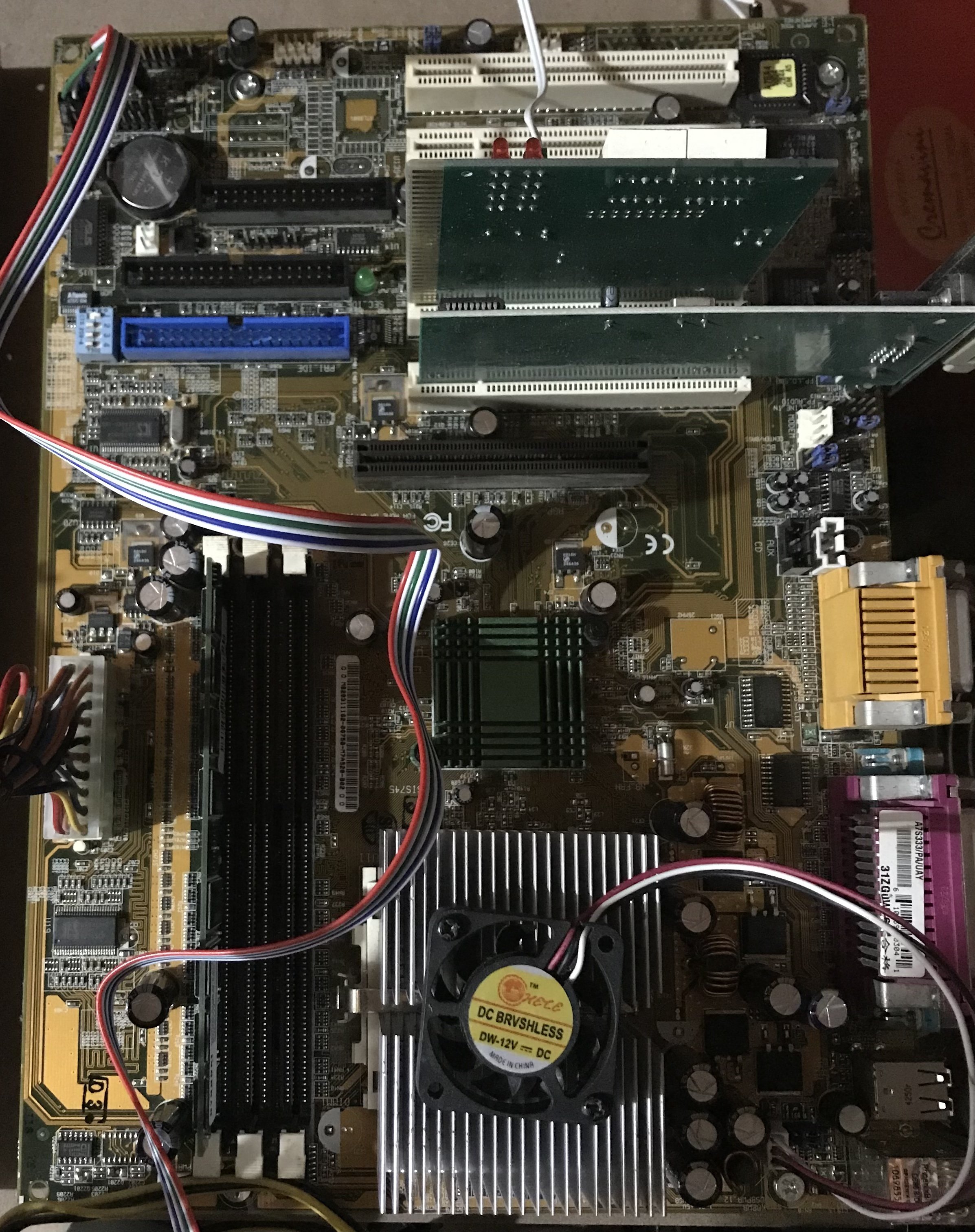 Poco fa ho finito ✔️ di preparare la Asus A7S333 per l’avvio, come prima cosa ho collegato un ventolino per la Cpu, è un po’ piccolo (4X4), ma per una semplice accensione va bene ?, ne cercherò una più grande, ammesso che ne abbia una da qualche parte, comunque se la trovo, la sostituisco. Ho messo la RAM arrivata con la scheda madre, e per il momento va bene ?, collegato anche la solita post card ISA-PCI, e uno ☝️ dei cavi switch led (mostrati in precedenza), per il momento non collego altro oltre la scheda video. Già invece di usare una AGP, ho utilizzato la PCI ATi Rage XL da 8MB, so che qui funziona perché funziona su una A7V600-X, in effetti come potrete vedere funziona!!!