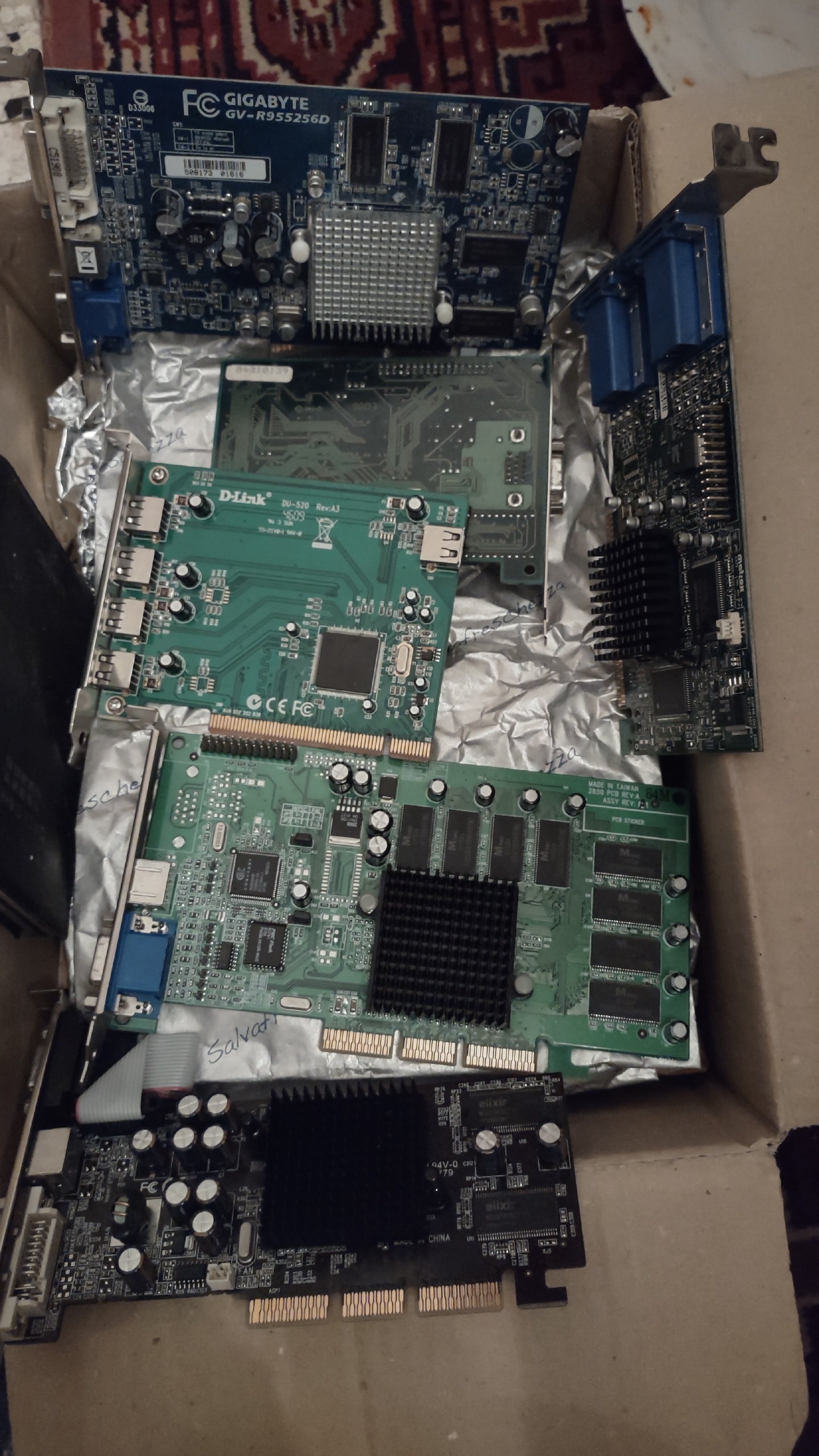 Altre schede, tra cui due AGP e una PCI-E, esattamente non so i modelli, tranne una POV GF FX5500 da 256MB, oltre queste nel lotto c’erano comprese tre PCI, una forse ? wi-fi, le altre due modem penso 56k, il tutto è costato meno di 10€ (senza spedizione ?), dopo una breve trattativa sono riuscito a farmi scontare qualche euro ?, pensavo fossero le solite schede economiche, ma potrebbe non essere così, ma credo che la sola 5500 valga già abbastanza, persino più del costo ? di tutto il lotto.