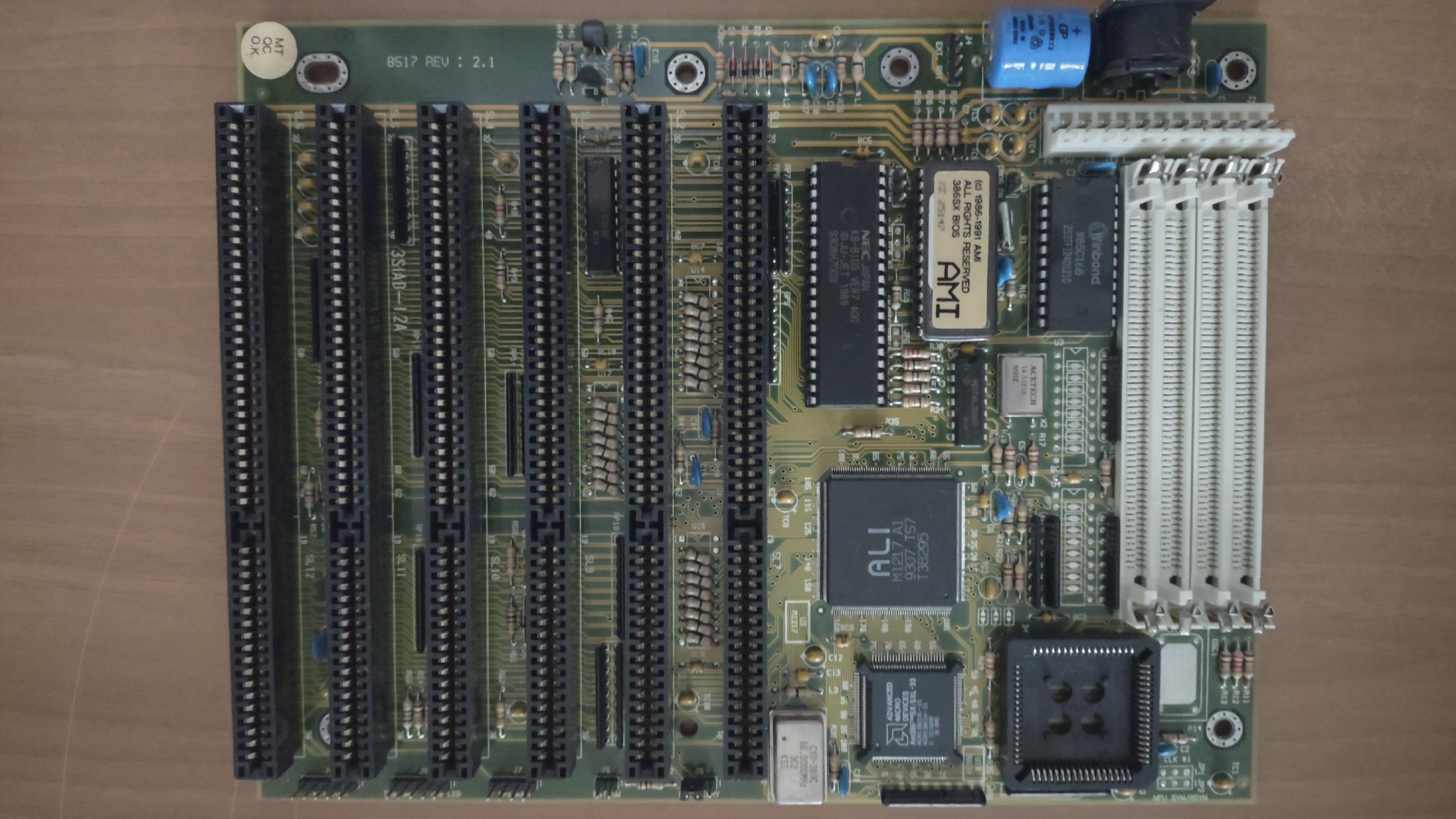 Allora se non ricordo male, la foto è di qualche settimana fa, è un 386 a 33 con 4 MByte di RAM una et4000 e il controller floppy/idea. Di 386 completi di case non ne ho avuti. La mainboard è nuova, la busta antistatica era sigillata quando l' ho presa 5/6 anni fa. Le altre schede e RAM l ho aggiunte io..