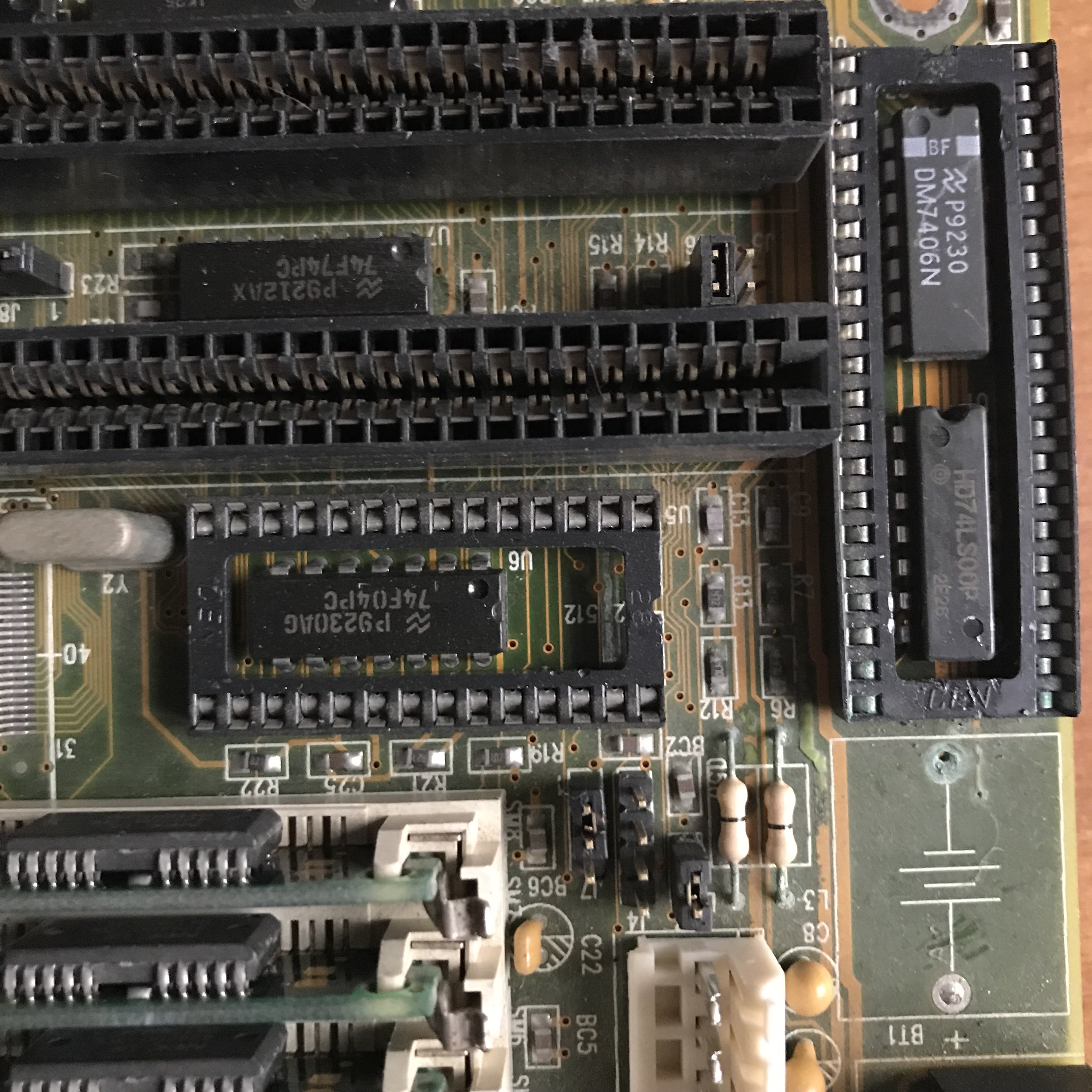 Tornato poco fa al lavoro, sul 486 4FLUD-1.0, ho già trovato alcuni potenziali problemi, ho rimosso sia il chip KB-BIOS che quello BIOS (AMI), come immaginavo sotto quello KB-BIOS ci sono altri due chip, U1 è un HD74LSOOP, U2 è un DM7406N, entrambe hanno 14 pin su due file di 7.