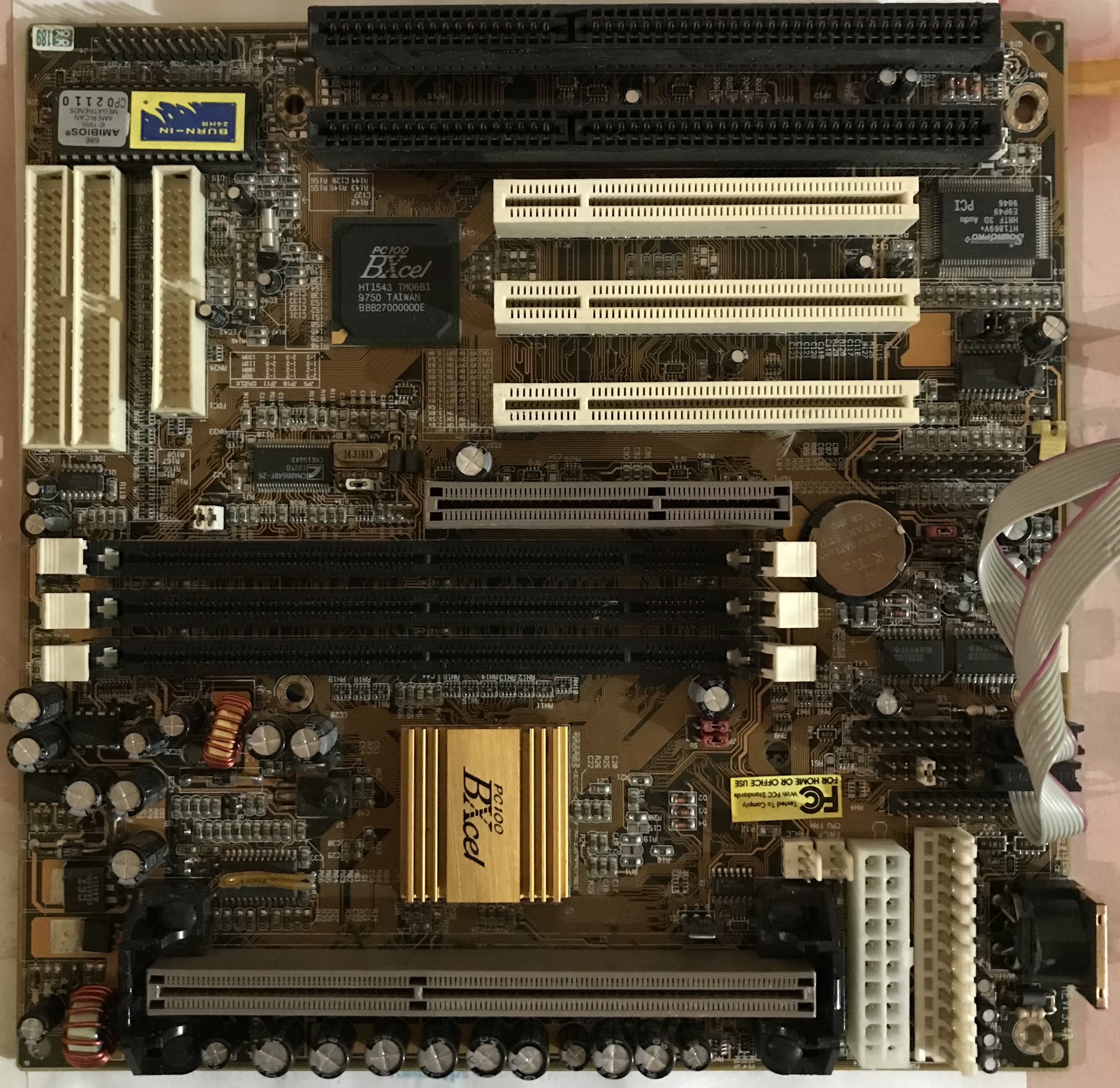 Arrivata oggi la scheda madre PCChips, il chipset marchiato BXcel, in realtà è un ALi, si tratta essenzialmente di una Slot1 in formato AT, qui in verità Baby AT, l’ho comprata perché ne avevo una non funzionante, ma oggi ho scoperto che non è come questa, sono due modelli diversi, questa è una M726, mentre quella non funzionante è una M729, oltretutto la M729 è AT (non Baby), pur avendo lo stesso chipset, gli stessi slot e lo stesso numero di banchi di memoria, sembra tutto uguale tranne il formato ridotto della M726.