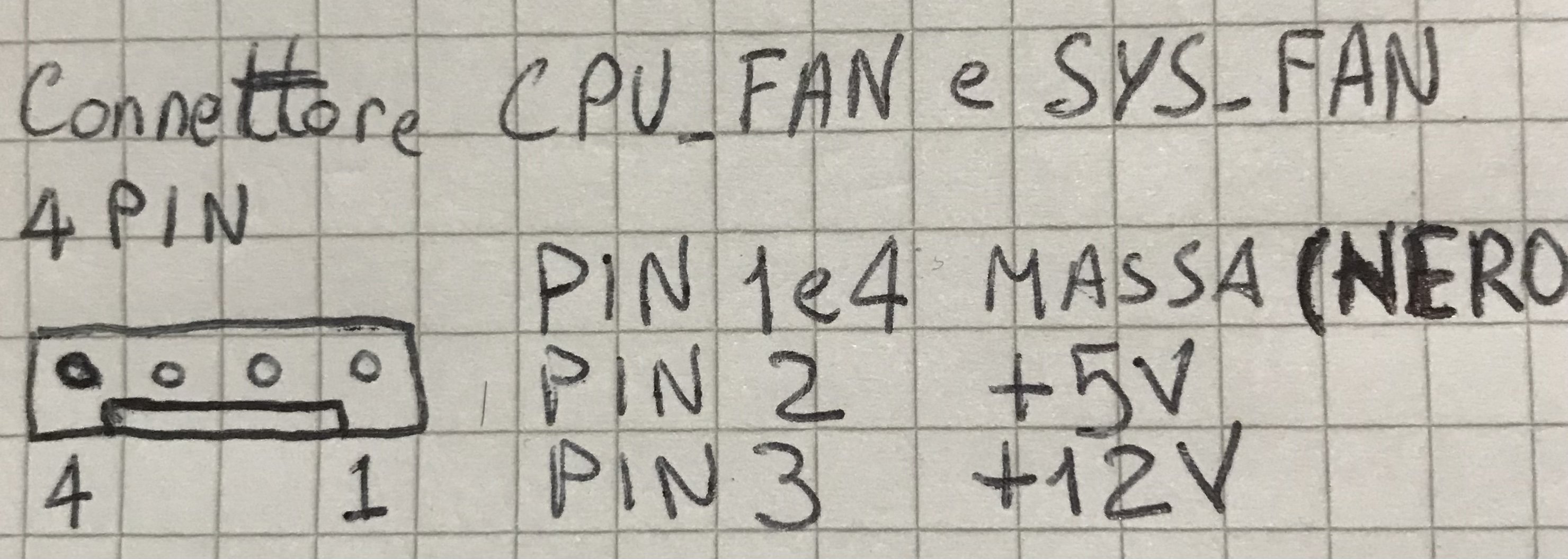 Ho verificato le tensioni presenti nel quattro pin, quelli in mezzo sono +12V e +5V, quelli esterni invece sono pin di massa, l’equivalente del filo nero, purtroppo ? non ho ancora ⚓️ risolto, ma penso di poter arrivare ad una soluzione, spero prima possibile, intanto ho fatto un collegamento diretto, tra il pin3 è il cavo positivo del fan, e avviata la MB funziona, cioè la ventola gira, purtroppo ? l’errore non è sparito, penso si debba collegare la ventola del +5V, non ho idea di che ventola funzioni a quella tensione ?, mi sembrano un po’ pochi per usare una ventola normale, tranne che quei 5V si possano alzare un po’, ma non credo sia possibile, senza fare modifiche alla MB.