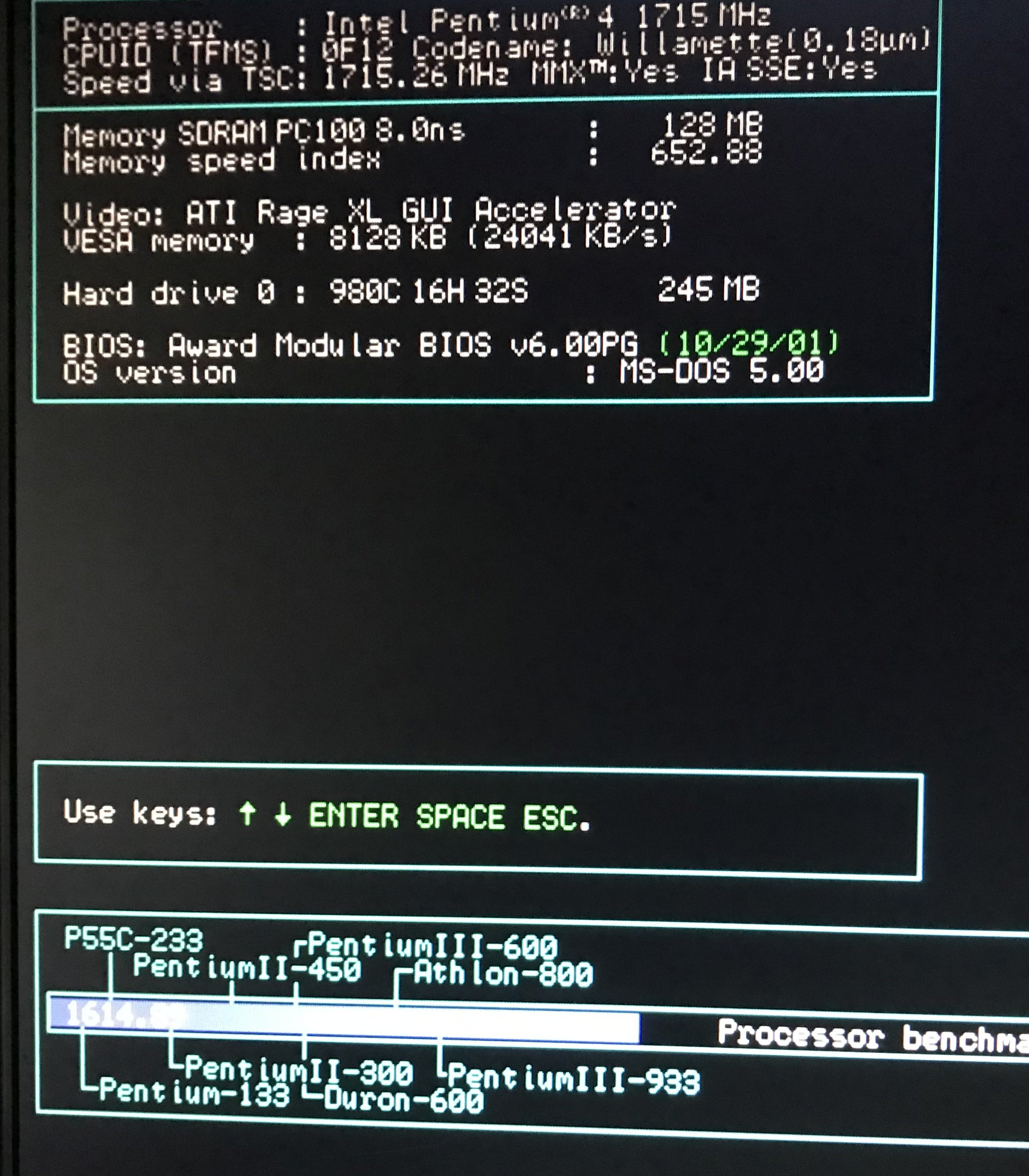 Ho scelto una RAM PC133 da 512 MB con chip da ambo i lati, ne ho altri due uguali da aggiungere, per adesso non vedrei alcuna differenza, li aggiungerò in seguito, quando carico Windows, e aggiungo un HD, per adesso posso fare altri bench DOS, e eventualmente provare qualche overclock, ma certamente ? con Windows potrò capire, se questo PC è ancora ⚓️ utilizzabile oppure il peso dei circa 23 anni si sente ???