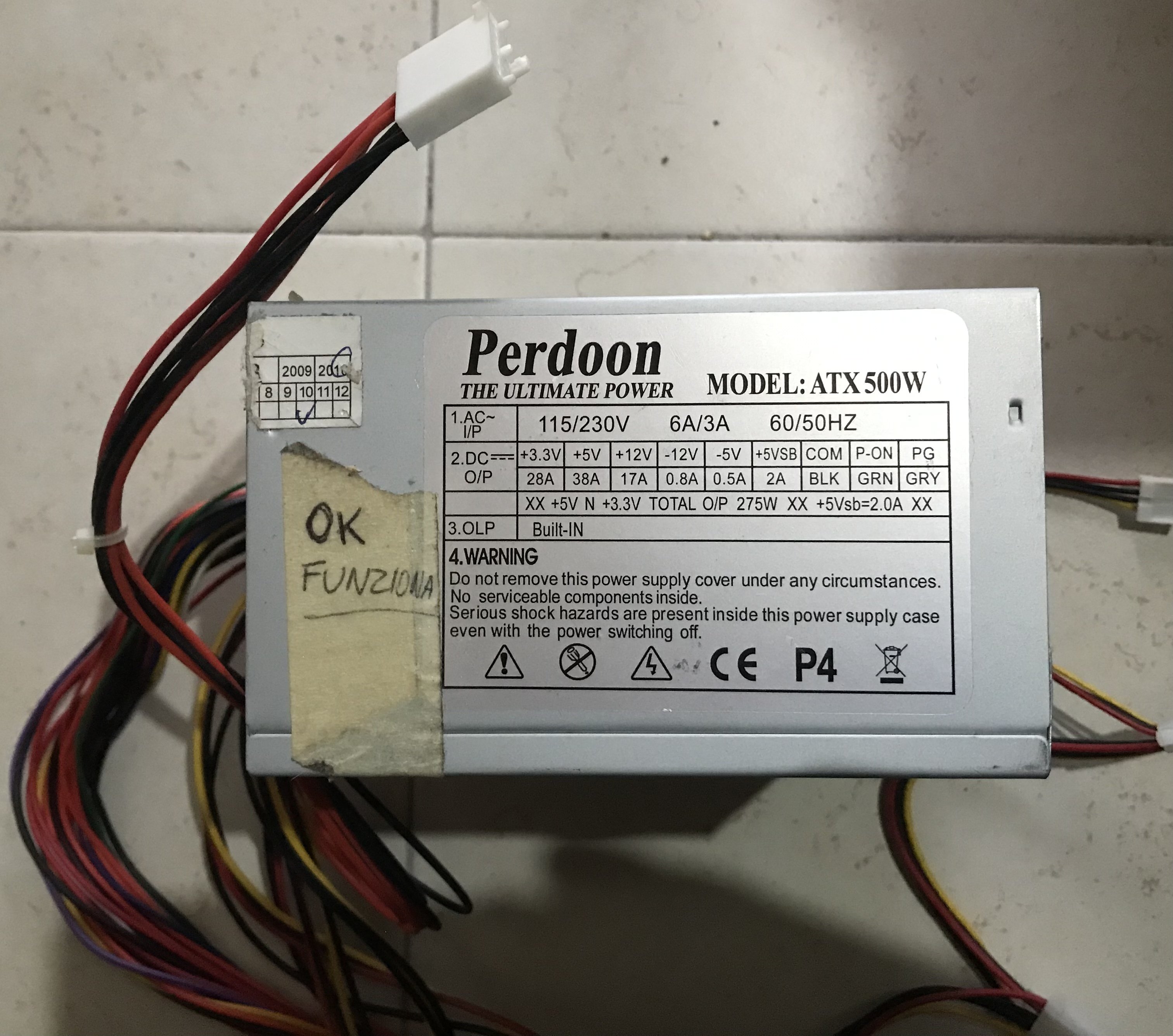 Avevo radunato un po’ di cose utili, per prima cosa ? l’alimentatore ATX con connettore 6 PIN per P4, quel particolare spinotto, ormai è da anni che è sparito, lo usavano solo i primi P4, non so perché ma in seguito non si è più usato, per fortuna tra gli alimentatori che uso al banco c’è un 500W (non credo reali??), che va bene ?.