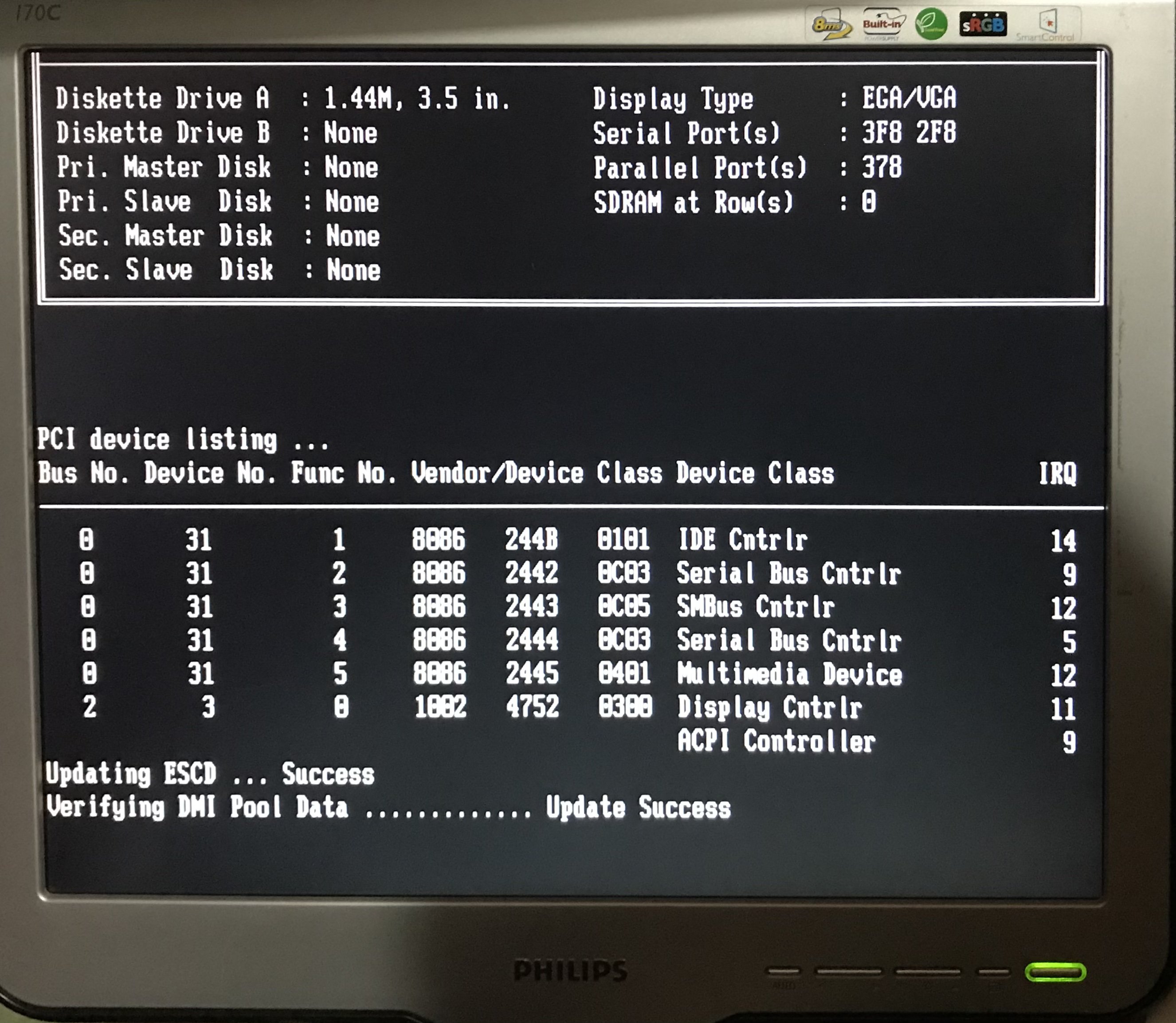 Inizialmente ho usato la solita scheda video PCI ATI Rage XL PCI da 8MB, per queste prove di avvio, va benissimo, appena ? finisco ulteriori prove, collego l’adattatore IDE-CF con DOS, e avvio alcuni bench, poi dovrei collegare un HD per caricare Windows, e relativi driver specifici per il video l’audio ecc…