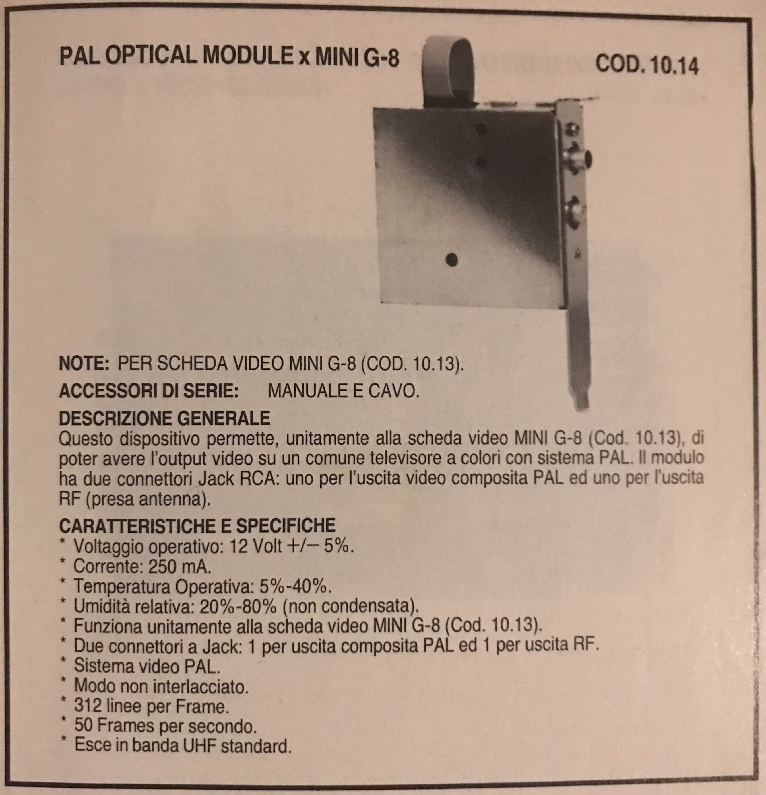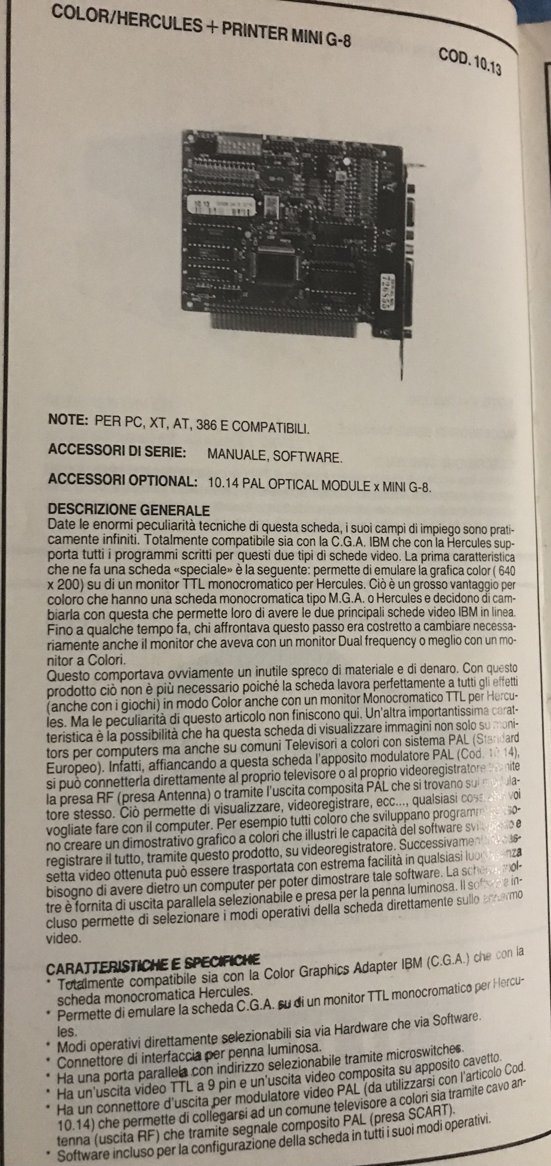 Oltre quello ho un vecchio catalogo HW, in cui spiega abbastanza dettagliatamente le caratteristiche HW di una scheda, e inoltre c’è una descrizione altrettanto dettagliata, in questo catalogo invece la scheda è una Color/Hercules, e ha un modulo aggiuntivo PAL Optical, che può collegare una TV Color (PAL).