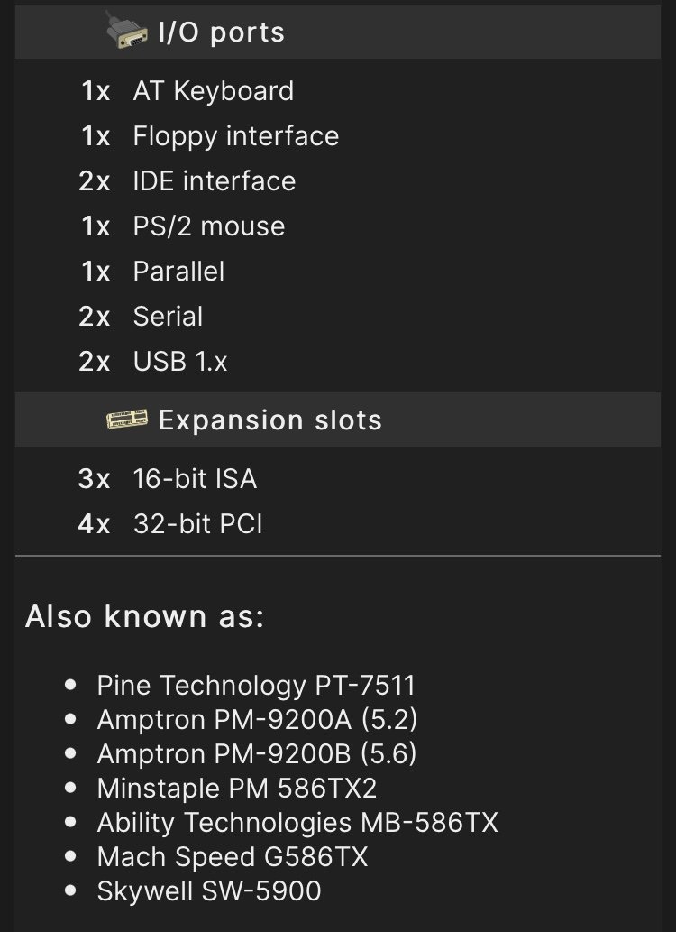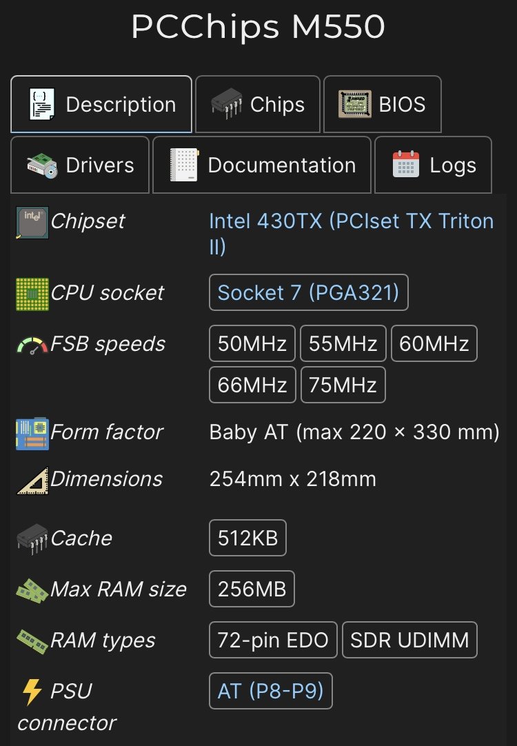 Il BIOS è della AMI, ed è tipo Windows, non mi piace particolarmente, ma credo possa esserci qualche aggiornamento, per il supporto di CPU successive, tipo i K6-2 e i K6-3, oppure i Cyrix MII, e magari ? anche il supporto di dischi più capienti, sembra che non si possa andare oltre gli 8 GB ??