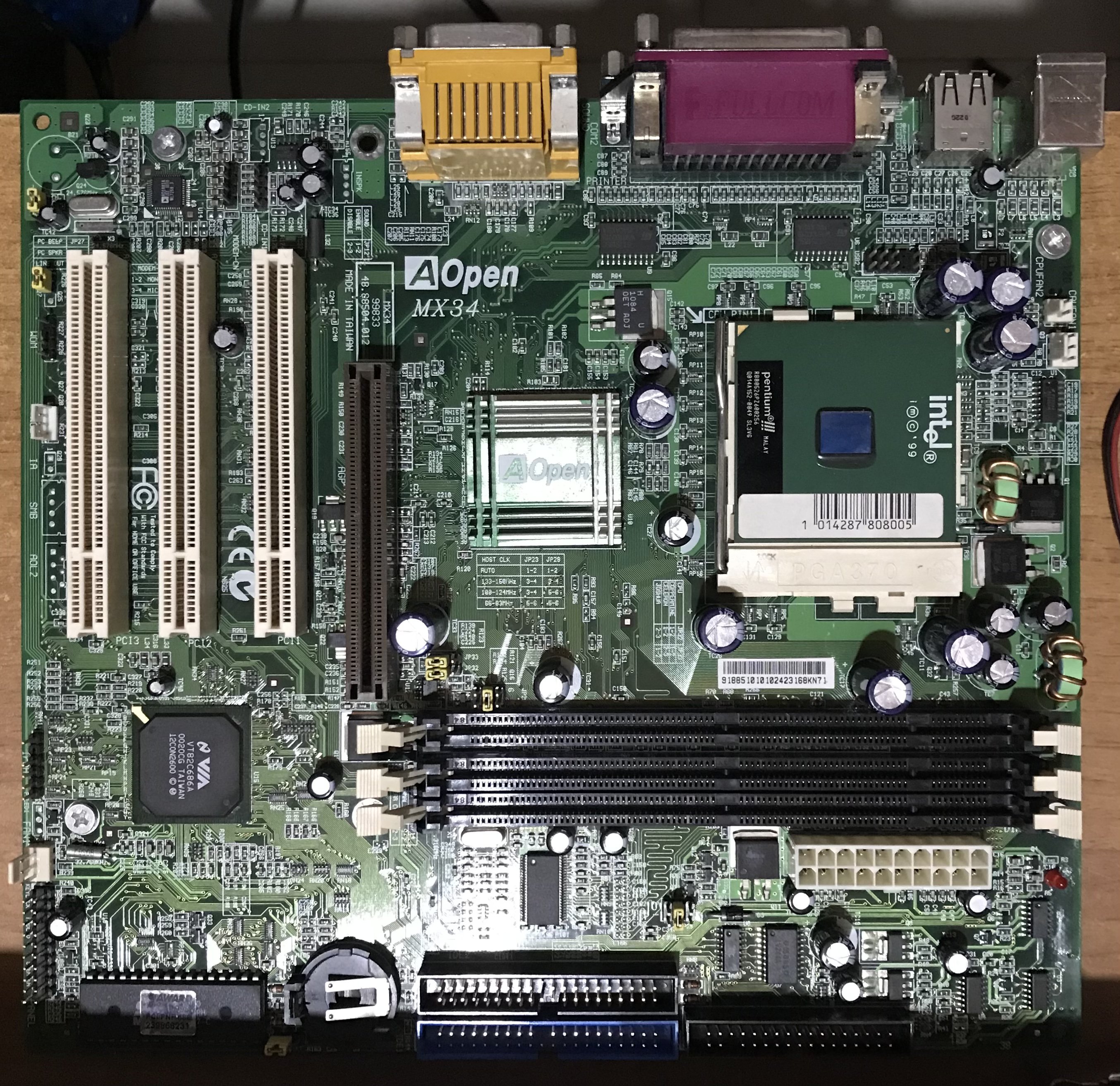 Per esempio ho questa AOPEN MX34 con P3 600, che visivamente sta benissimo, e potrebbe essere provata, c’è soltanto una cosa ? che non mi piace ?, il chip BIOS saldato direttamente sulla MB, cioè non è rimovibile, ma se avesse problemi di BIOS, bisognerebbe dissaldarlo, per poterlo inserire nel programmatore, non credo esista qualcosa, tipo una presa da agganciare sopra.