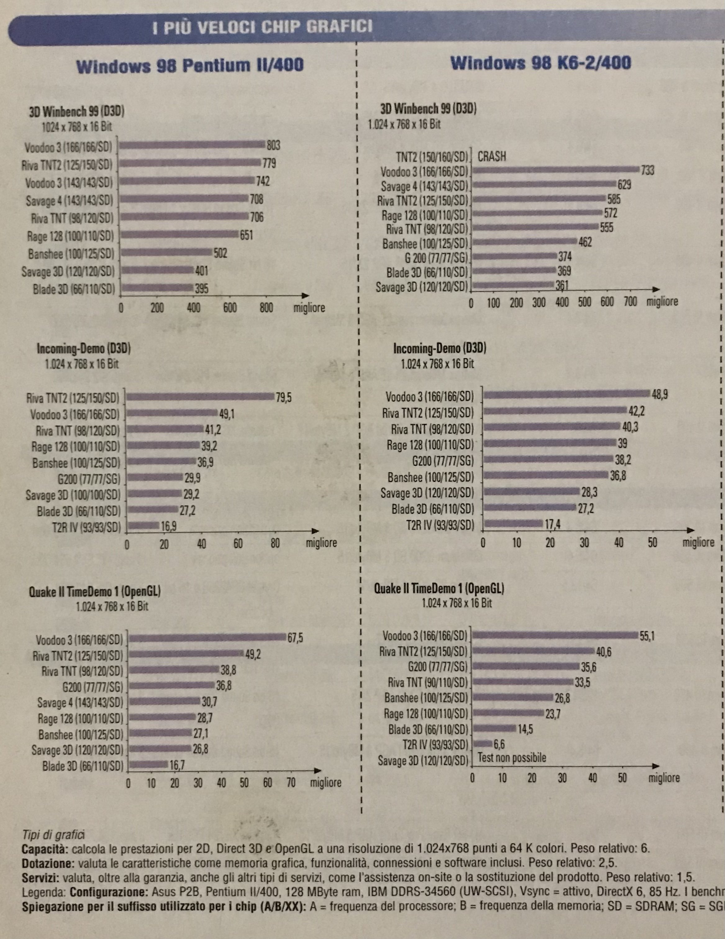 Da quello che si vede, Voodoo 3 e RIVA TNT2 sono le migliori, mente la Savage 3D risulta tra quelle più lente.
