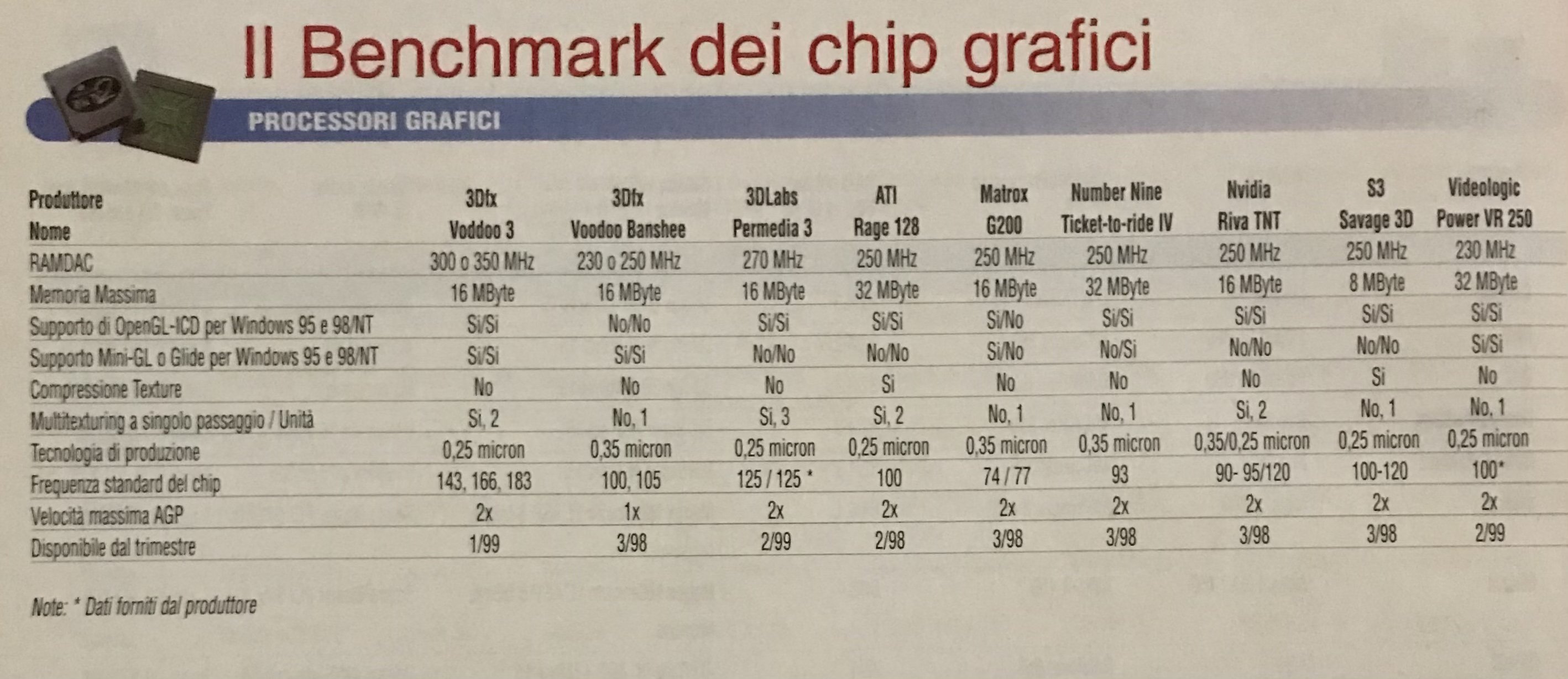 Per quanto riguarda i chip grafici, confermo che in quegli anni la sfida per le massime prestazioni era tra la Riva TNT2 (prodotta da NVidia) e la Voodoo3 (prodotta da 3dfx), mentre le schede grafiche  ATI erano più lente e ancora poco conosciute tra gli appassionati di giochi :leggi:/emoticons/fact.gif.70def7c3110e9abfc15e400dc0af8e5c.gif" title=":leggi:" width="24" />