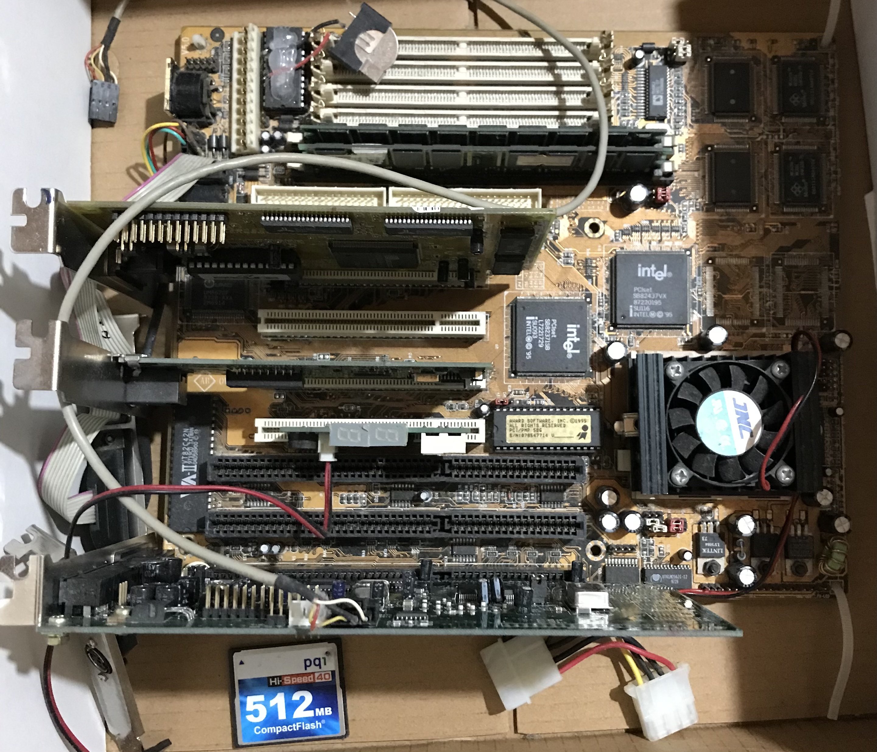 Cercando una MB simile, ho trovato invece una PCChips con Intel VX e regolatori switching, il VCore minimo è 2.5V, così ho preso un AMD K6-2 400 e l’ho sostituito al P200MMX, però ho un paio di problemi da risolvere, uno