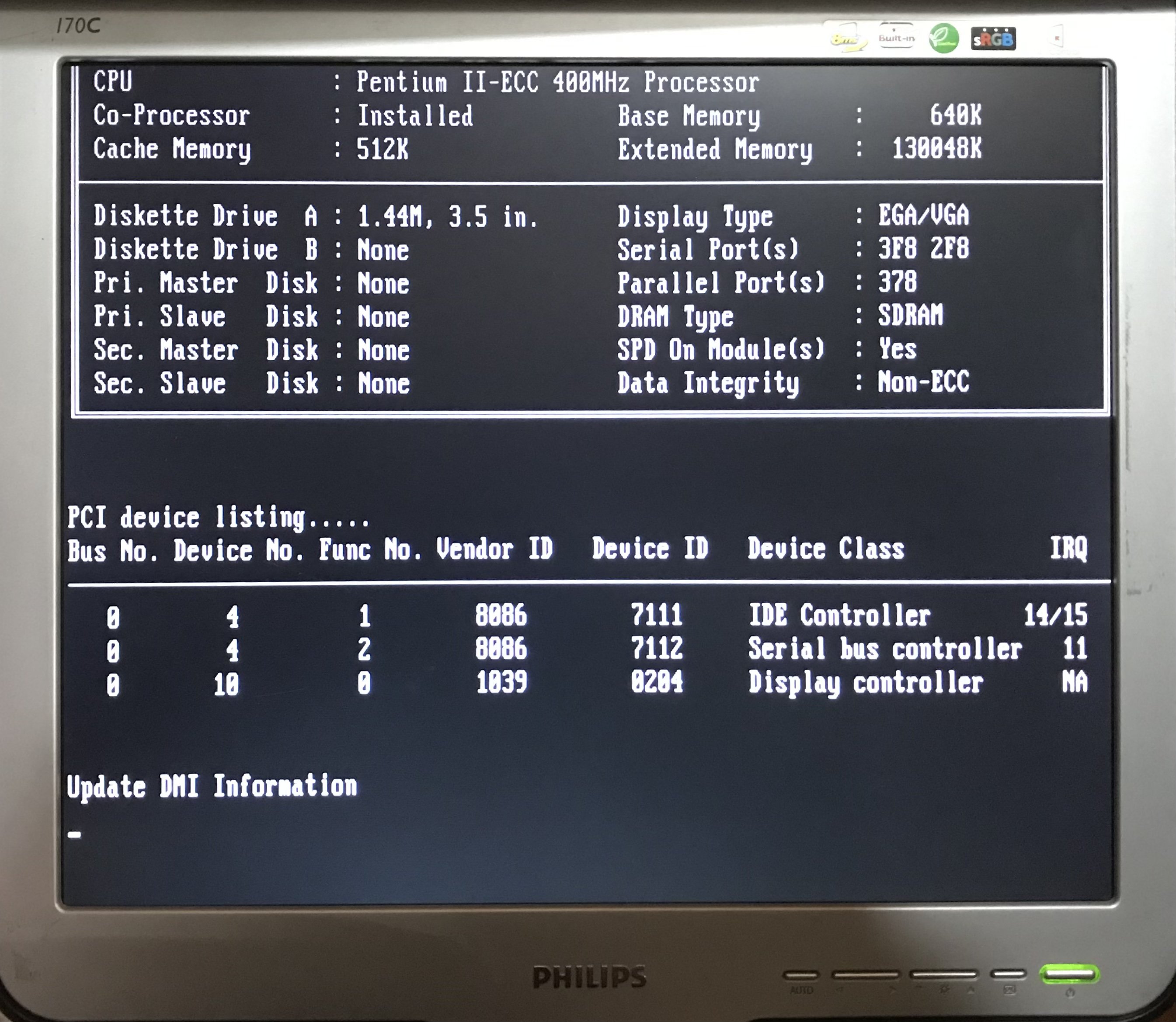 Dato che ormai ? sto lavorando su più schede madri Slot1, ho questa Matsonic MS7070S da provare, avevo già selezionato sia la RAM che la CPU, due banchi CL2 PC100 da 128 MB ciascuno, e un P3-500 Slot1, decido quindi di fare dei controlli preliminari e provare a vedere se si avvia (?).