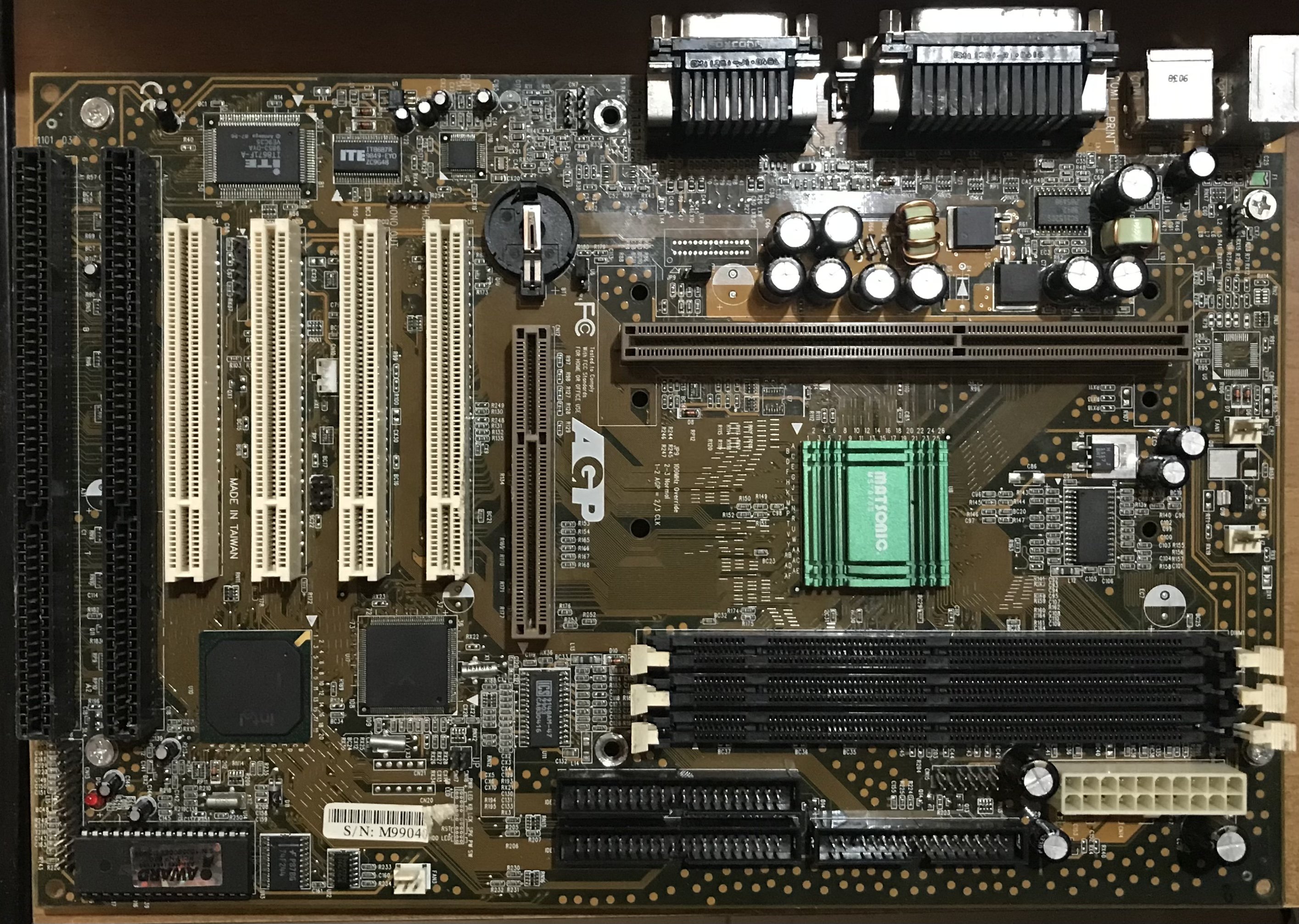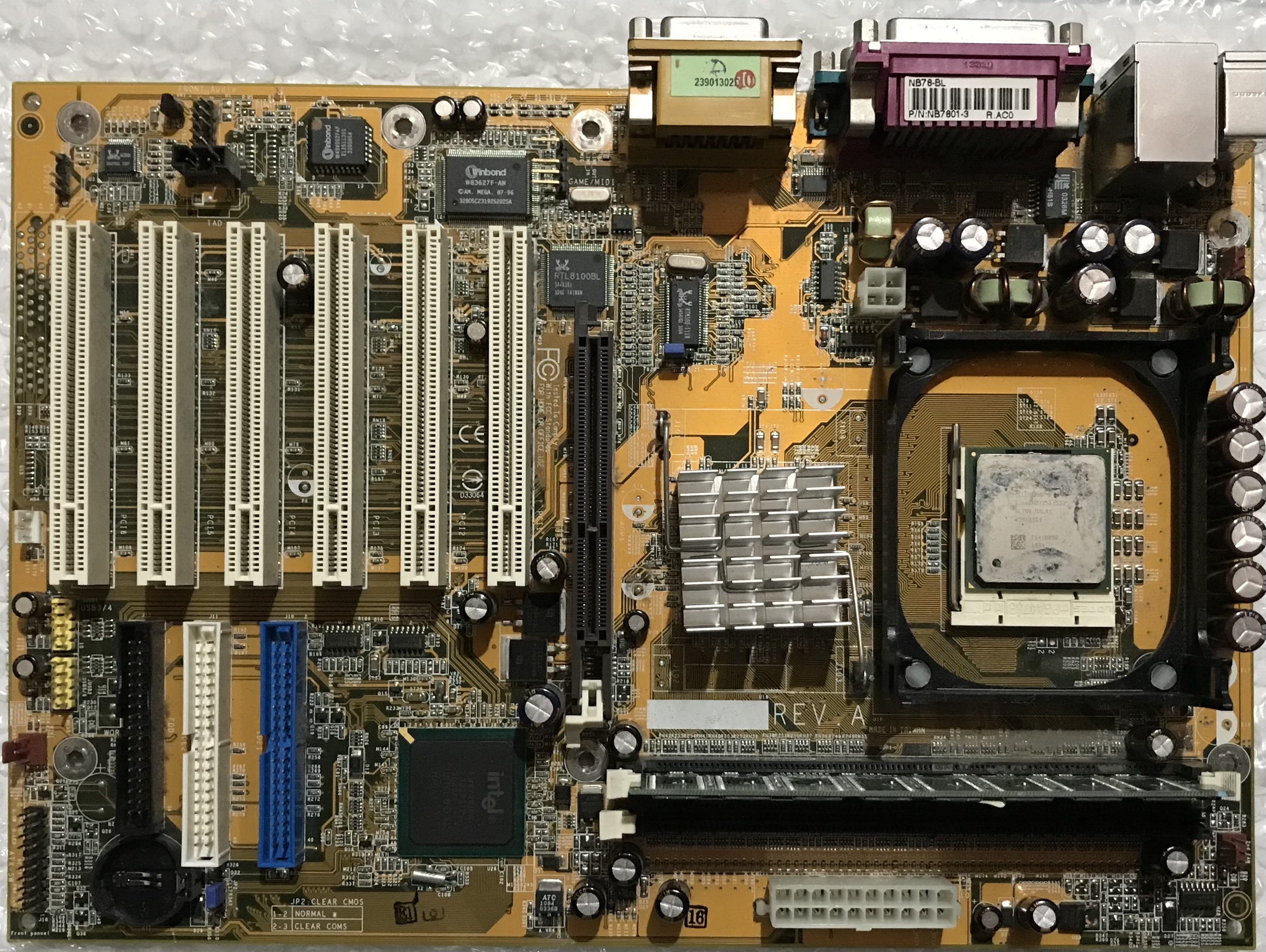 Dunque, ho identificato la scheda madre ATX, si tratta in breve di una DFI modello NB78-BL, chipset i845PE e supporta le CPU con FSB fino a 533, insomma tutto sommato potrebbe essere una bella scheda, e c’è persino un numero elevato di slot PCI, ben sei più quello AGP, questo permette di aggiungere schede per upgrade, ad esempio una scheda controller SATA, ai tempi si potevano mettere due schede Voodoo 2, scheda TV, scheda FireWire, insomma difficilmente si potevano riempire tutti e sei, però non era impossibile.