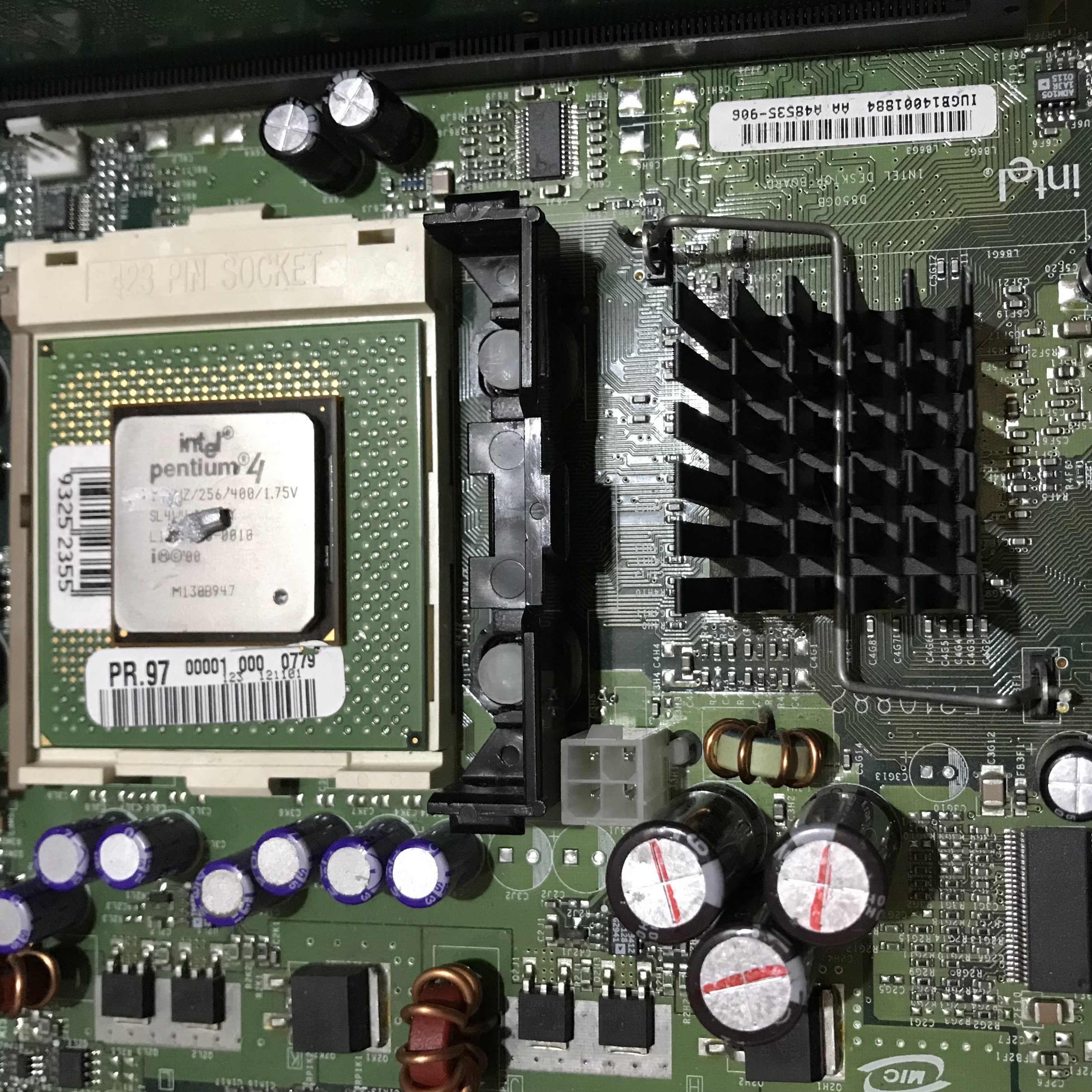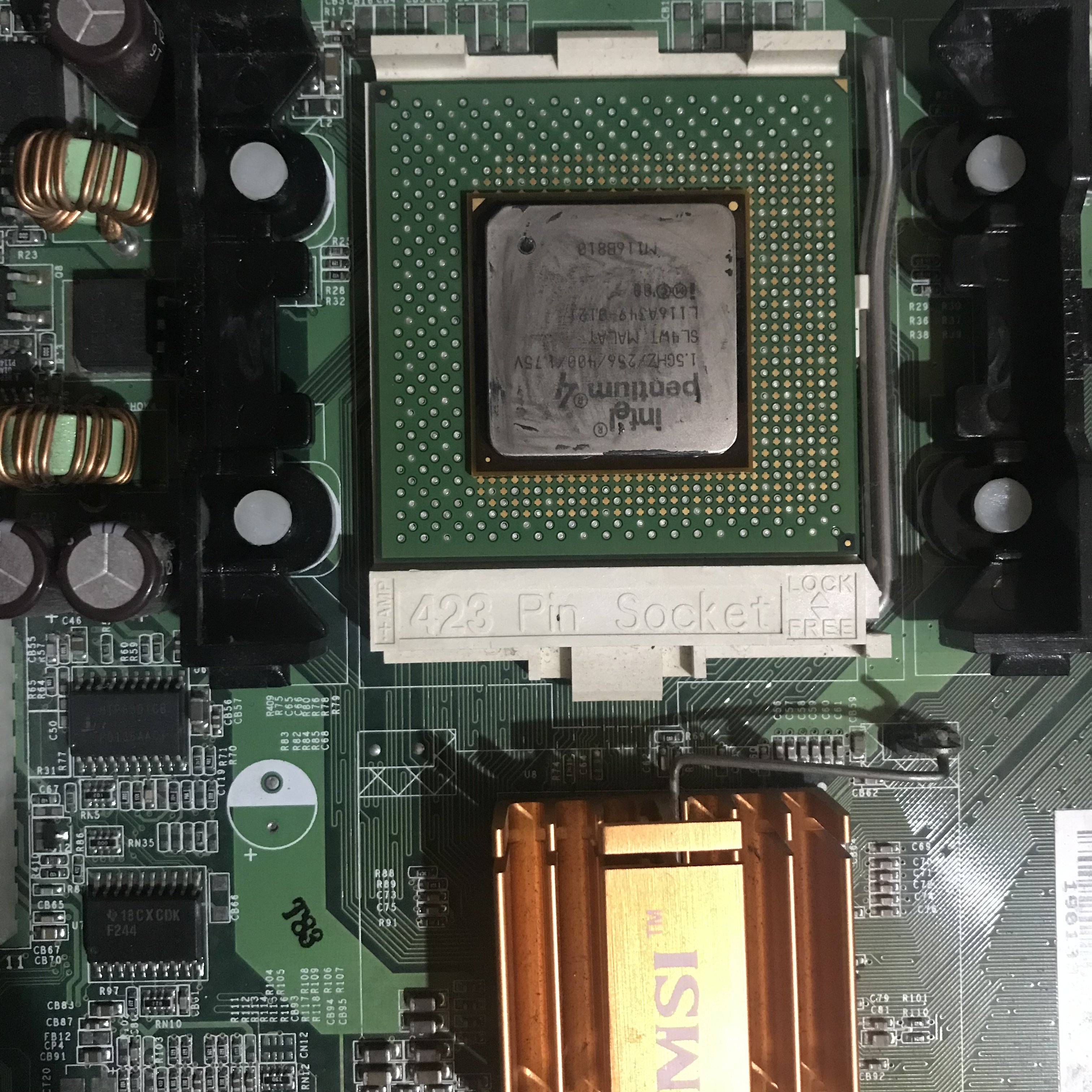 Per quanto riguarda la scheda madre MSI S.423, ho visto la CPU installata, è un Pentium 4 1.5GHz/256/400/1.75V, una CPU abbastanza normale in quegli anni, e l’avrei cambiato con un 1.7GHz, se la scheda funzionava.