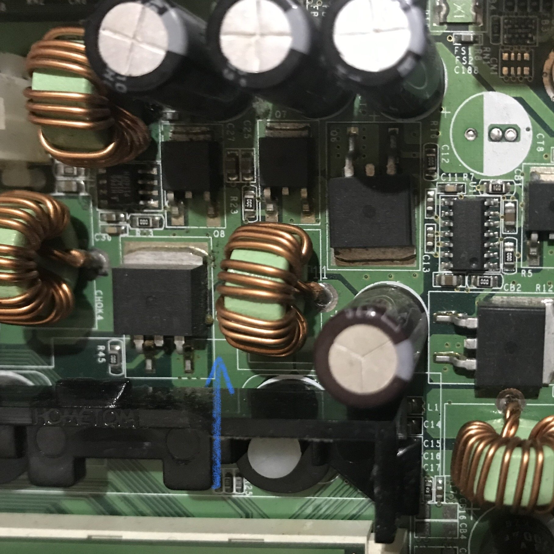Osservando la scheda noto qualcosa, che potrebbe spiegare perché non parte, in almeno uno dei Mosfet, noto una specie di pallina, che potrebbe essere il risultato di un guasto, con relativo surriscaldamento???