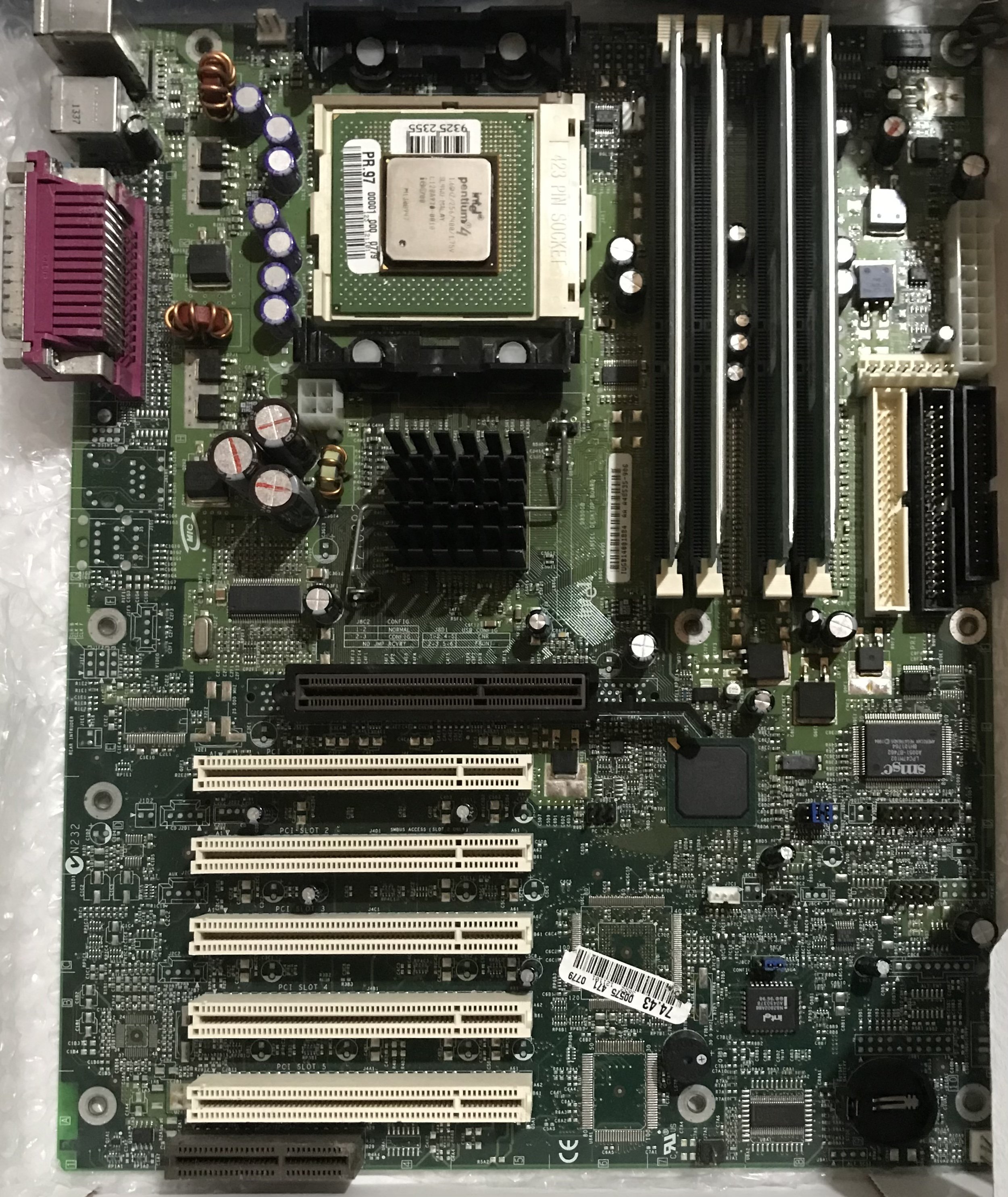 Una S.478 in formato uATX, con due slot RAM DDR e il supporto CPU Prescott, chipset VIA, uno slot AGP (come tutte le MB), tre PCI (non express), e uno credo CNR o qualcosa del genere. Nella scheda madre sono stati rimossi almeno un paio di condensatori elettrolitici, forse ? nel tentativo di sostituirli perché rigonfi (?)