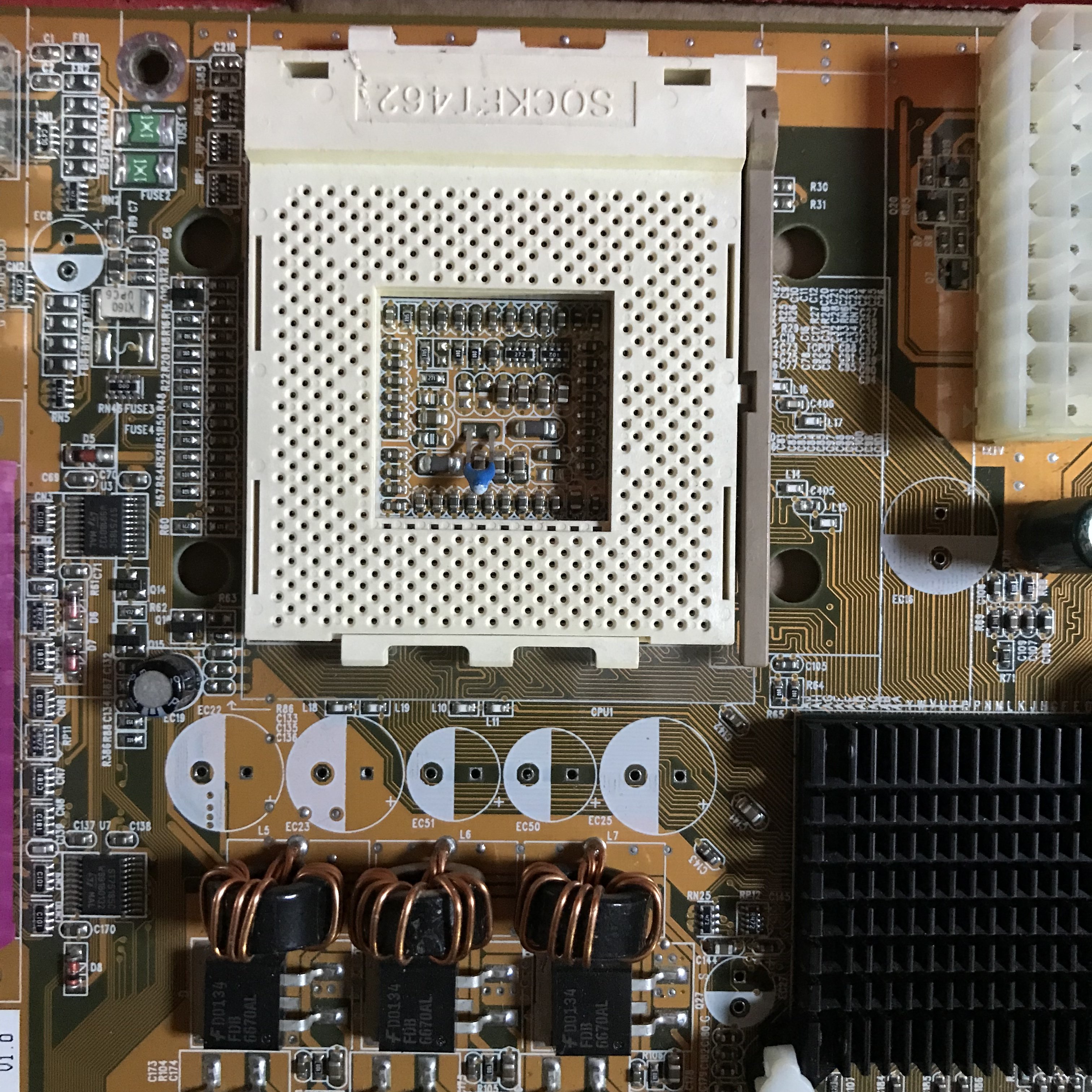 La prossima scheda che ha bisogno di un cambio di condensatori elettrolitici (rigonfi), è una Gigabyte 478 GA-8I848PM, con inclusa una CPU Intel Celeron, ha guardacaso cinque condensatori elettrolitici da 3300uF da sostituire, e avendone cinque a disposizione, userò quelli, spero ? in questo fine settimana di fare il cambio, e avviare i bench e i diagnostici, ma tutto dipende dalla riuscita della riparazione, se c’è la schermata BIOS a video, dovrebbe essere tutto Ok ??