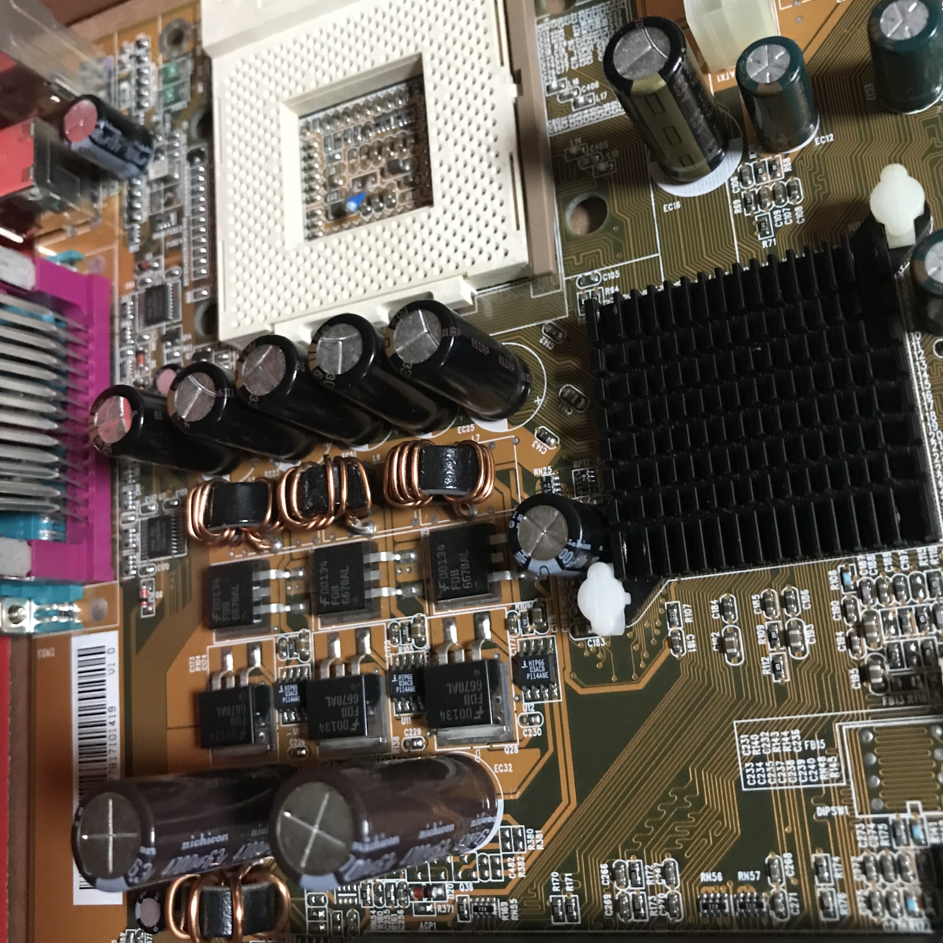 Li sostituisco, perché in queste condizioni potrebbero creare problemi di instabilità o impedire l’avvio, l’ESR alto farà scendere alcune tensioni, penso quelli di RAM chipset e AGP, non ho cambiato gli altri condensatori elettrolitici presenti, perché sono più grossi e non ho ricambi, ci sarebbero altrettanti (all’incirca) 1500uF 6.3V attorno alla CPU, visivamente sono ok, ma controllandoli, potrebbe anche non essere così, quindi proverò a vedere se la scheda funziona, e dopo vedremo se c’è qualche problema, controllerei anche quelli grossi (?).