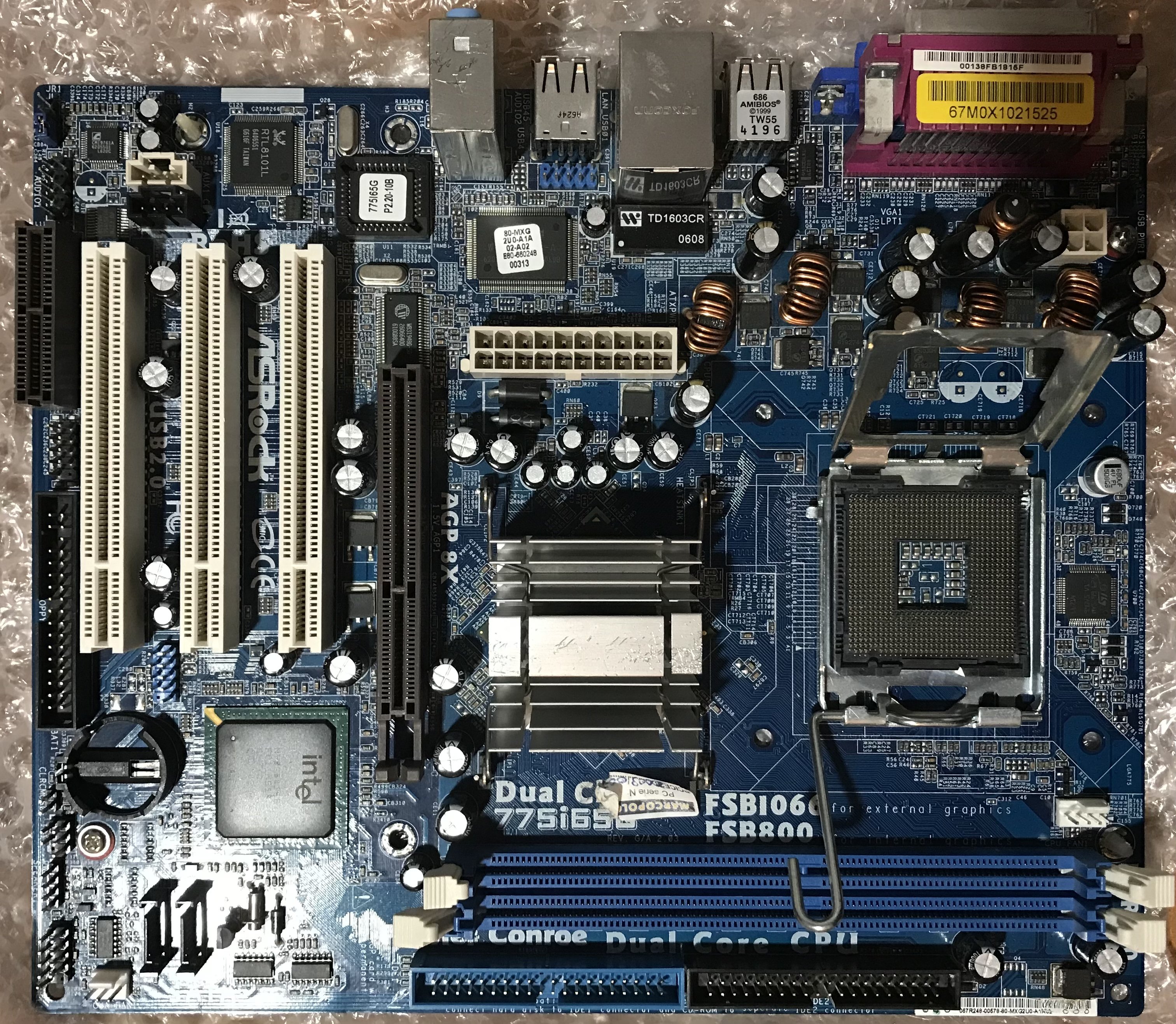 Una scheda madre che in passato ho cercato di sistemare, è una ASROCK 775i65G, è interessante 🧐 perché supporta CPU Core2 Duo e ha lo slot AGP, normalmente avremo avuto un PCI-E 16X, è altresì vero che il video è integrato, quindi può funzionare benissimo senza una scheda video AGP o PCI, integrati ci sono sia l’audio che la LAN, insomma c’è tutto l’indispensabile (tranne le porte seriali), basta 😡 aggiungere CPU e RAM, per avere un PC funzionante (in questo caso no 👎 ovvio 🙄),.