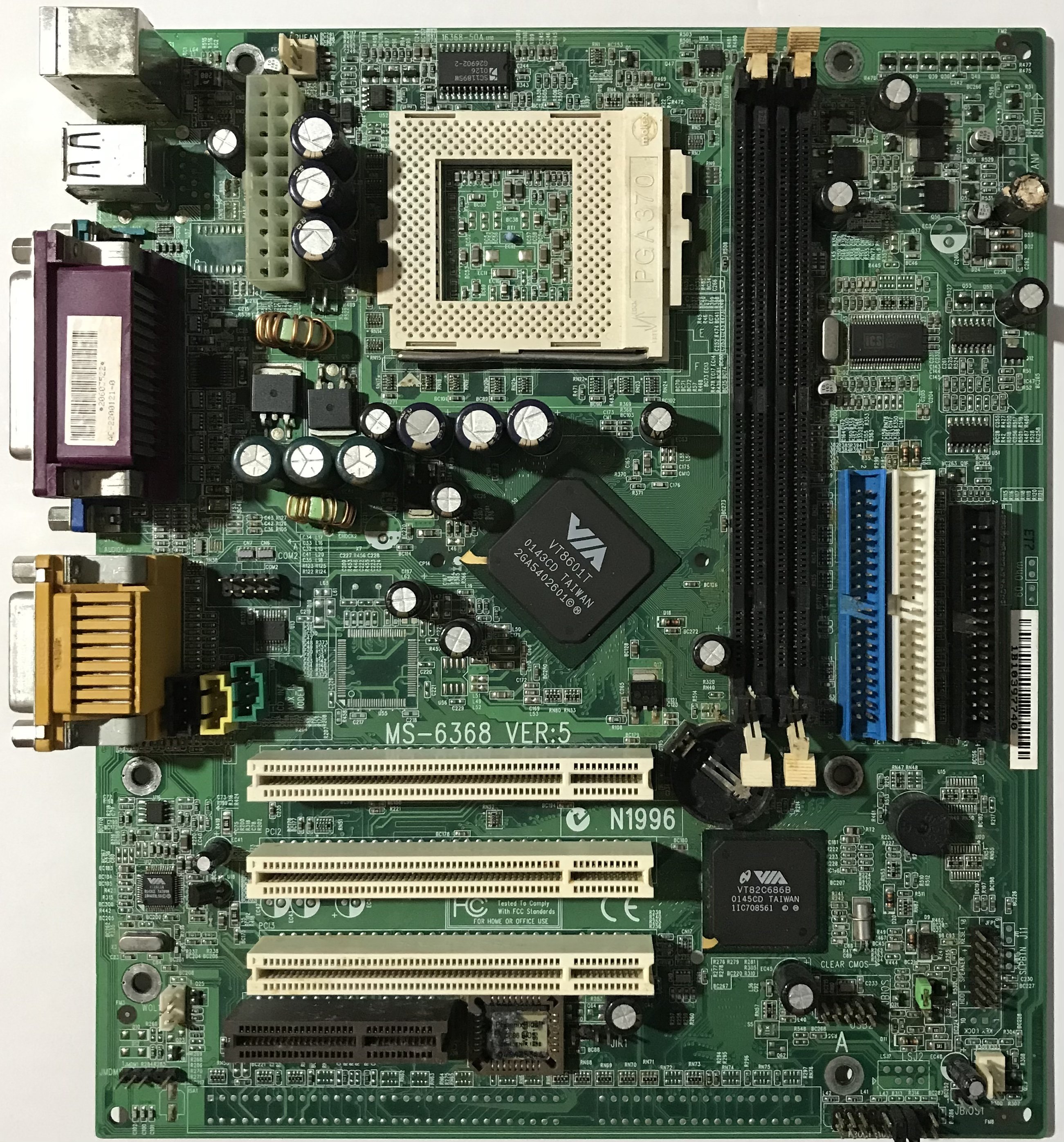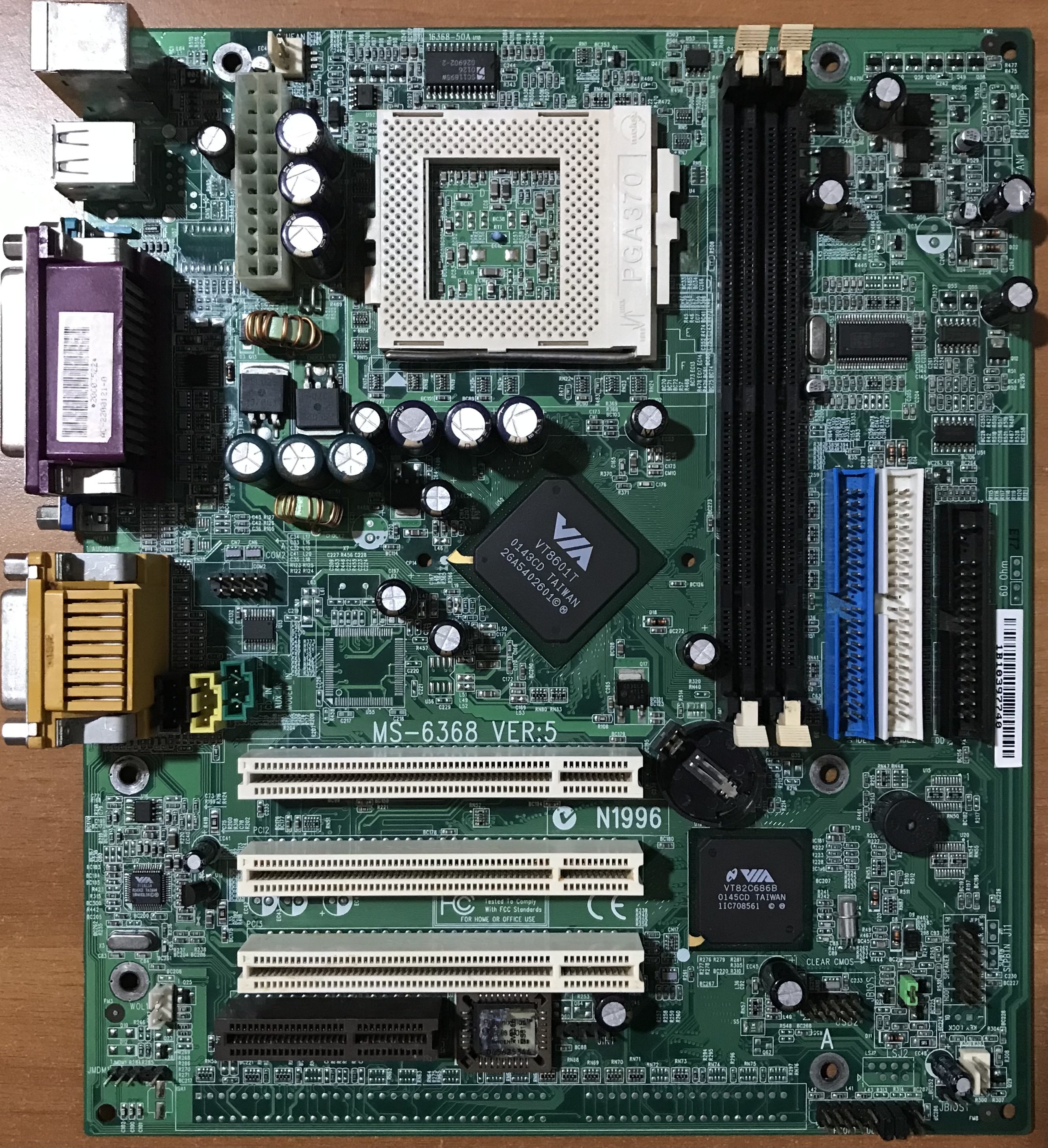 Visto che recentemente ho sistemato la scheda madre QDI Advance 10T, e che supporta i Tualatin, senza alcuna modifica, ho cercato un’altra scheda simile che ho in riparazione, si tratta di una MSI MS6368 VER:5, S.370 chipset VIA, N.B. VT8601T e S.B. VT82C686B, formato uATX con tre slot PCI e un CNR, purtroppo 😣 nessun AGP, ma forse 🤔 si potrebbe aggiungere uno slot ISA, manca l’ AGP perché il video è integrato così come l’audio, gli slot RAM sono solo due.