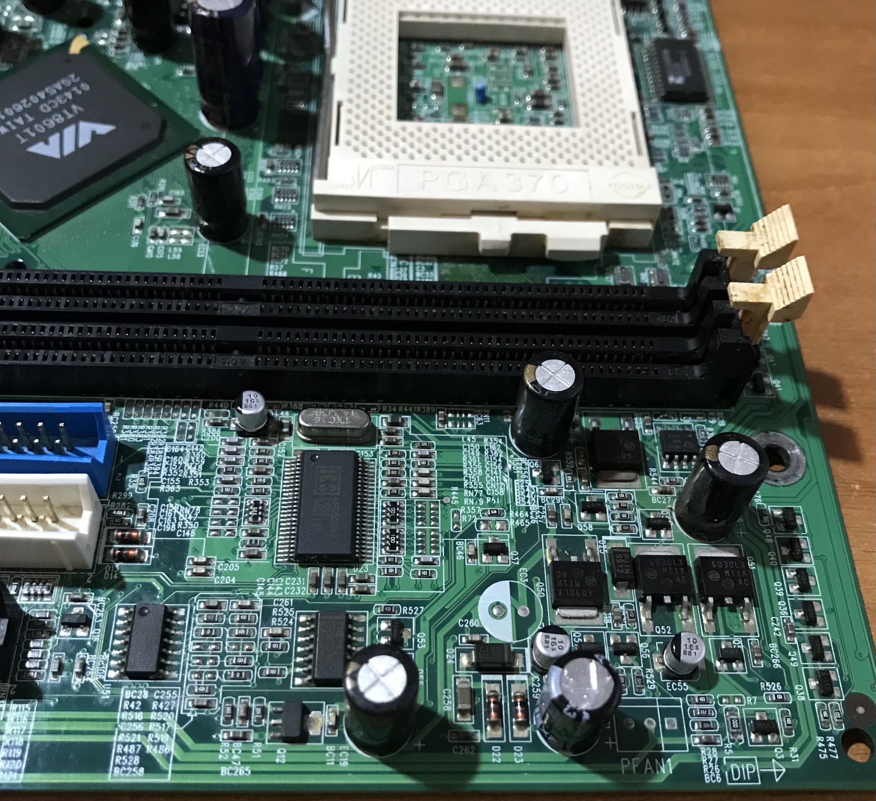 Ha il solito difetto dei condensatori elettrolitici rigonfi, uno è il solito 3300uF 6.3V, però essendo di un marchio non di qualità, cambierei anche gli altri sei, in totale sono sette, ci sono poi altri tredici condensatori elettrolitici rigonfi, sono tutti da 1000uF 6.3V, e sono sparsi attorno alle RAM al chipset e agli slot PCI, qui praticamente sono tutti da cambiare, purtroppo 😣 non ho un quantitativo sufficiente per sostituirli tutti, andrebbero ordinati, e al momento non mi è possibile, forse 🤔 potrei in alternativa, recuperarli da qualche scheda rottame, ma il meglio che potrei trovare sono degli OST, quindi niente che possa andare bene 😌, certo li proverei e li verificherei con il mio ESR-meter, ma potrebbero riservare qualche sorpresa 😱, cioè risultare in cattive 🦹‍♀️ condizioni, pur essendo visivamente a posto.
