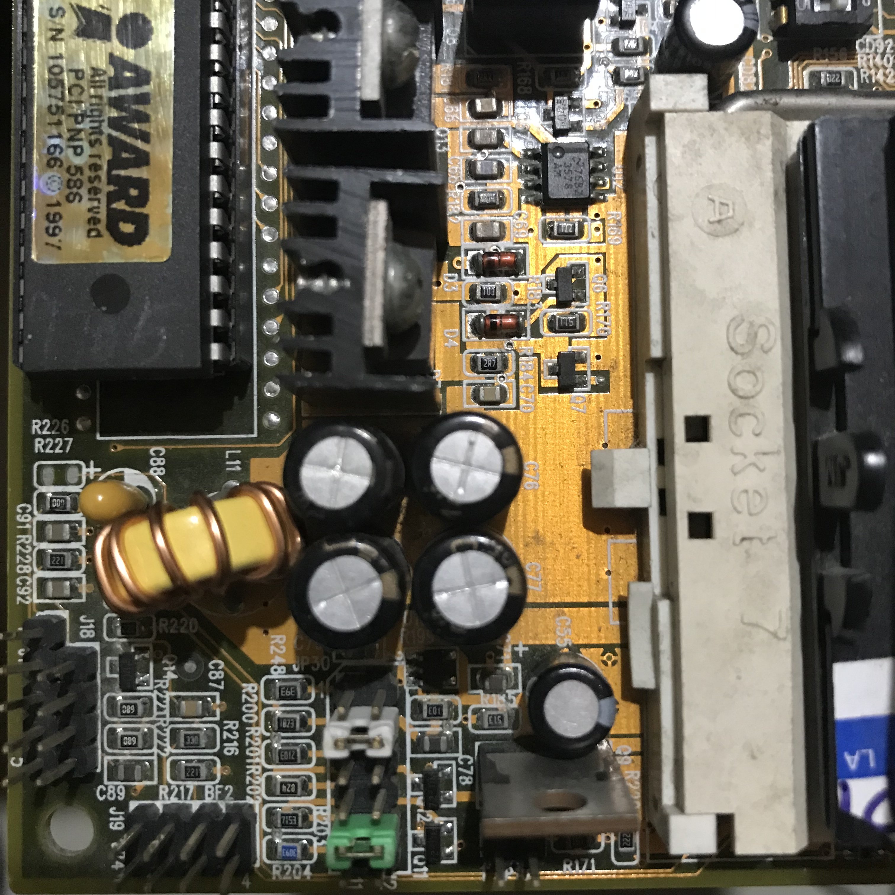 Ho fatto un test di avvio, prima con il Pentium 133, in seguito ho cambiato CPU, e ho messo un Pentium 200 MMX, con questo ho fatto delle misurazioni, per cercare VCORE inferiori a 2.8V, il PC si è sempre avviato, ma le misurazioni sul Mosfet o nell’induttore, sono state tutte alquanto strane, le devo riprovare, perché pur cambiando posizione ai jumper vedo uno strano 3.06V, anche quando dovrebbe fare soli 2.2V, penso di dover trovare i PIN nel retro della CPU (socket 7), e vedere cosa 😨 c’è realmente, di solito quel tipo di misurazione funziona molto bene, ma qui forse 🤔 ci sono altri componenti nella linea VCORE, che potrebbero fare scendere il voltaggio di 3.06V a quello selezionato.