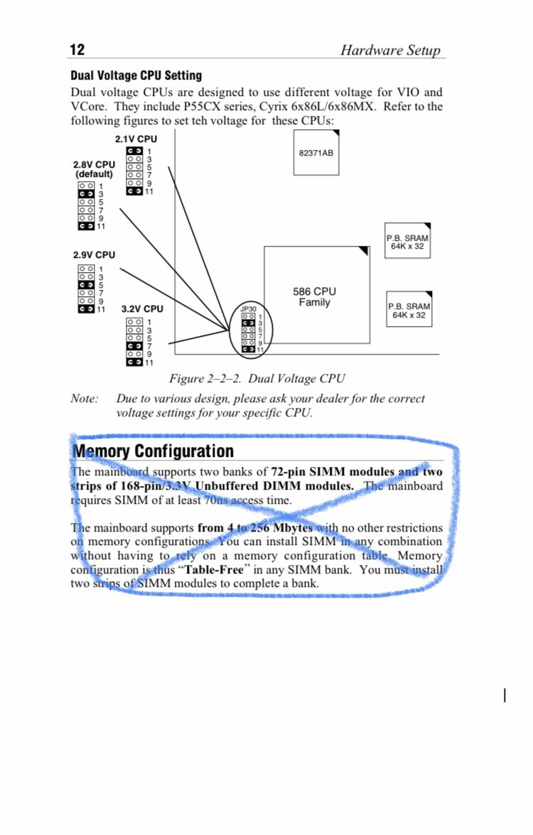 singola 3.3V, perché uso al momento un Pentium 133, ma cambiando CPU con un MMX o un K6, dovrei avere automaticamente il VCORE intorno a 2.6V (perché ho il jumper su 9-10 invece di 11-12), se effettivamente sarebbe così, potrei mettere il jumper su 1-2 invece di 3-4 e teoricamente otterrei circa 1.9V, che per me sarebbe perfetto 🤩
