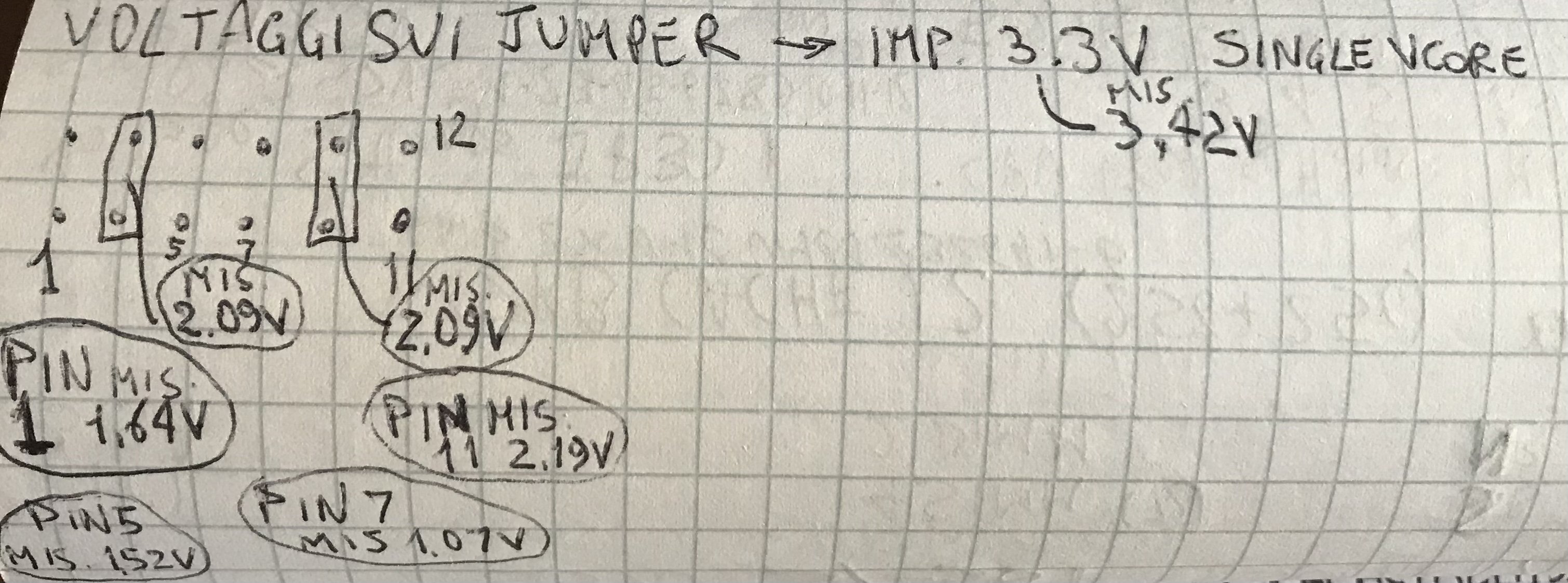 Con le selezioni precedenti, sposto da 11-12 a 9-10, e stranamente i valori misurati sono praticamente uguali, questo significa che probabilmente cambia il VIO, magari si abbassa di 0.2V, ma il VCORE è selezionato dai jumper 1-2 3-4 5-6 7-8, mentre il VIO dai jumper 9-10 11-12, per cui qualsiasi tentativo da fare è solo sui jumper da 1-2 a 7-8.