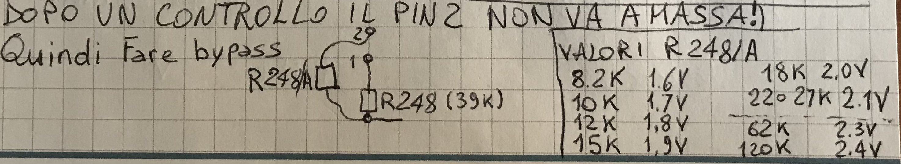 sono arrivato alla fine, è tutto molto semplice occorre un resistore (i valori sono nei messaggi precedenti) da collegare al PIN2, e alla pista di giunzione delle resistenze R200-1-2.